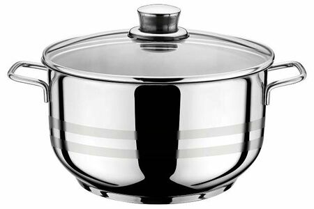 Серия вега - посуда из высококачественной хромоникелевой нержавеющей стали. Имеет трехслойное капсульное дно с теплораспределительным слоем. Дно - индукционное. Толщина стенок - 0,5 мм. Внутренние размеры корпуса: диаметр верха - 20 см, высота - 9,5 см. Полировка - комбинированная: глянцевая с матовыми полосками. Ручки металлические. Посуда укомплектована стеклянной крышкой с металлическим ободом и пароотводном. Подходит для всех типов плит. Можно мыть в пмм.