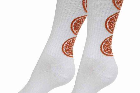 Высокие белые носки, резинка - лапша, с изображением сочных апельсинов на паголенке сзади.
