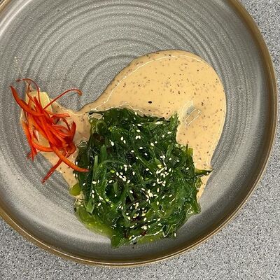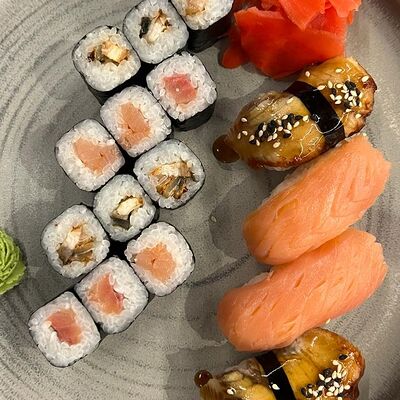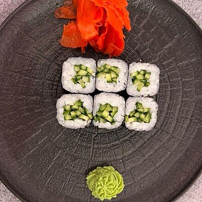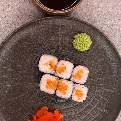Окунь, японский рис, имбирь, соевый соус, васаби