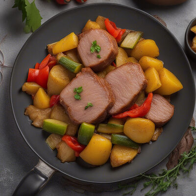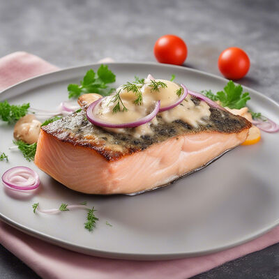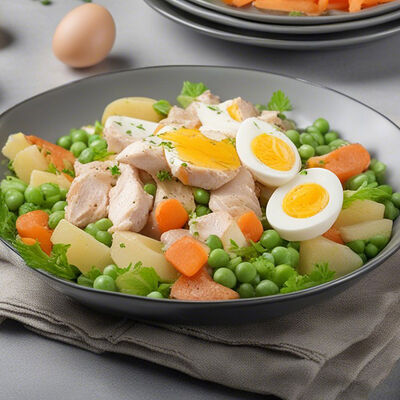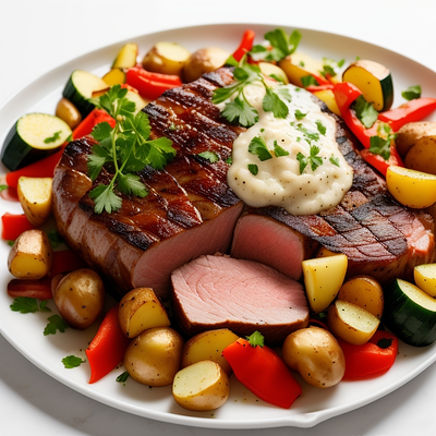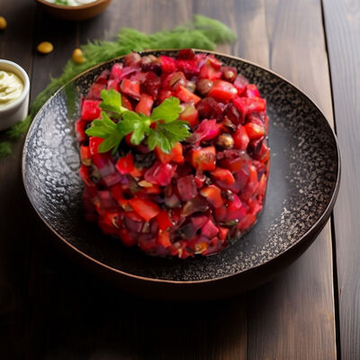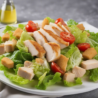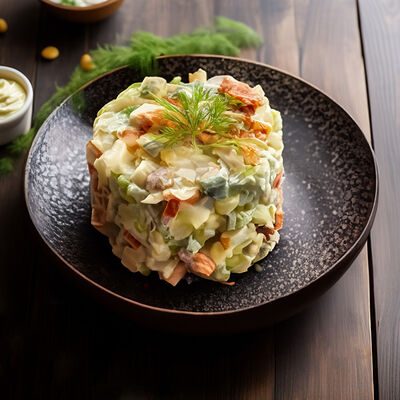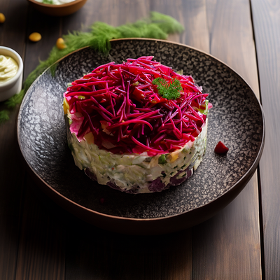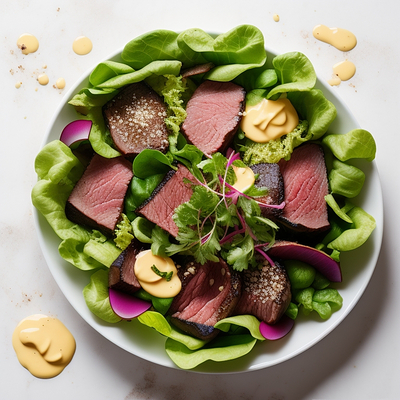 Листья салата, редиска, язык говяжий, гренки ржаные, майонез, мёд, горчица