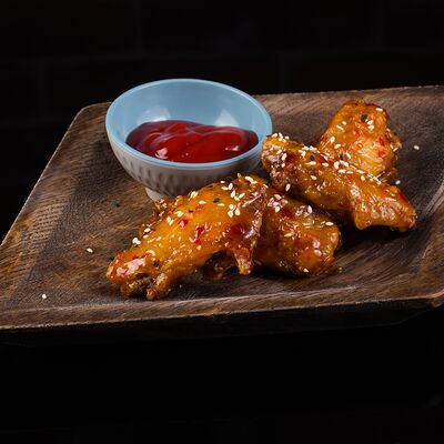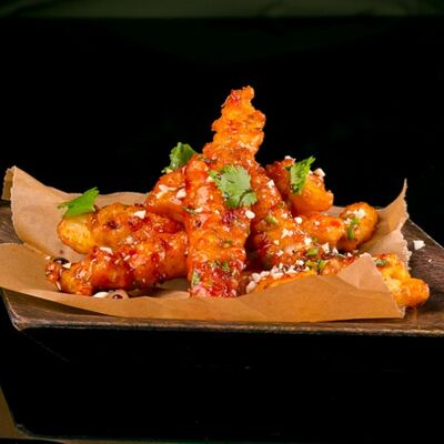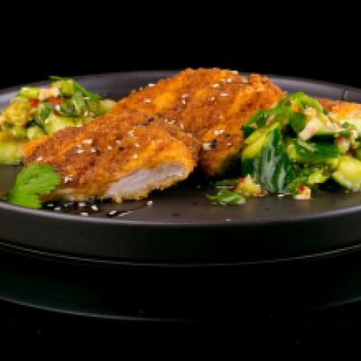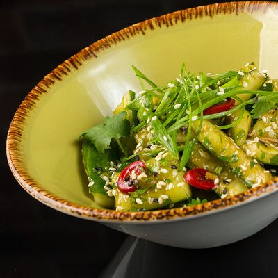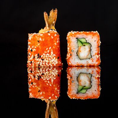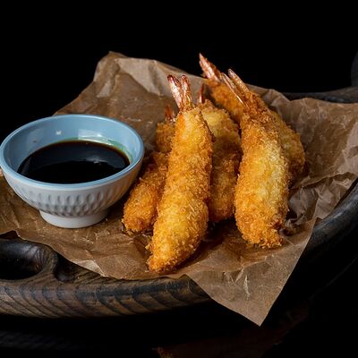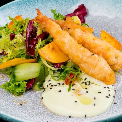Тигровая креветка, кляр, салатный микс, огурец, авокадо, соус орехово-кунжутный