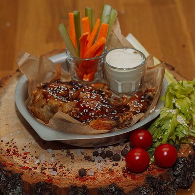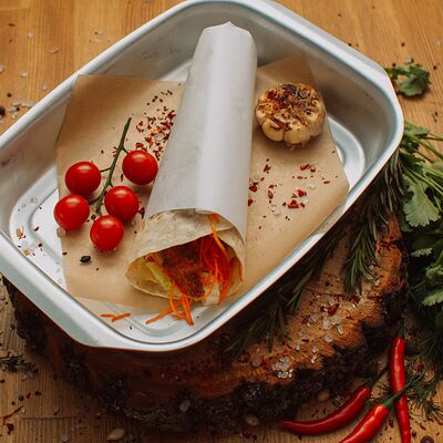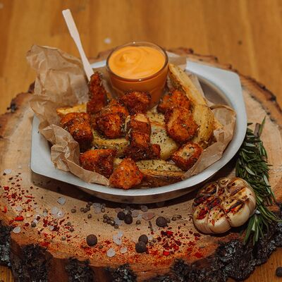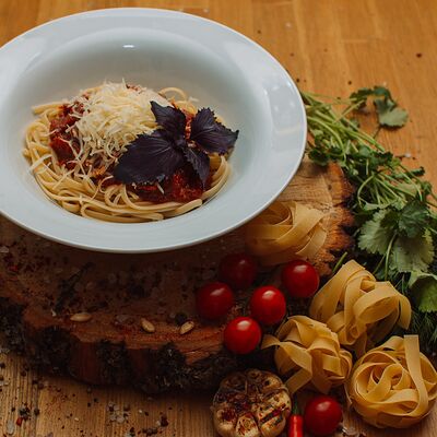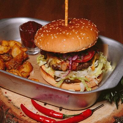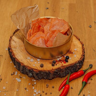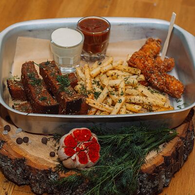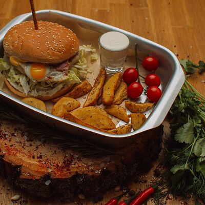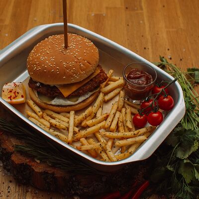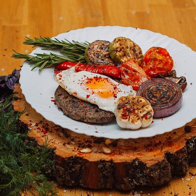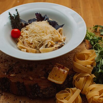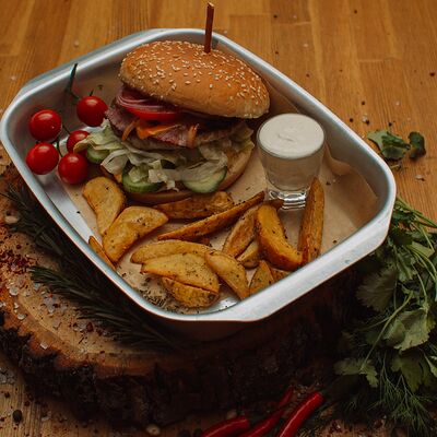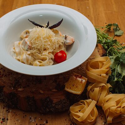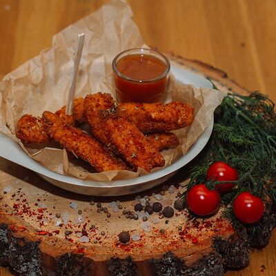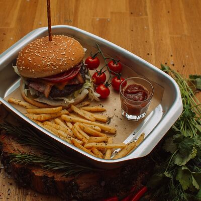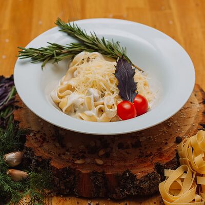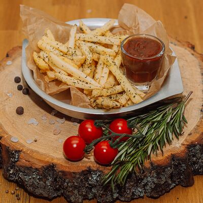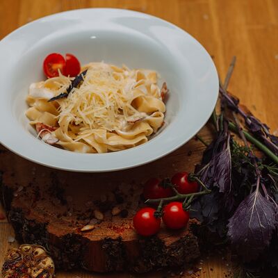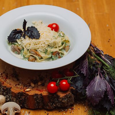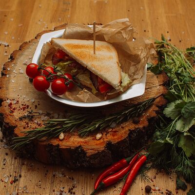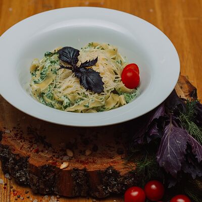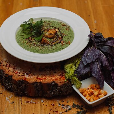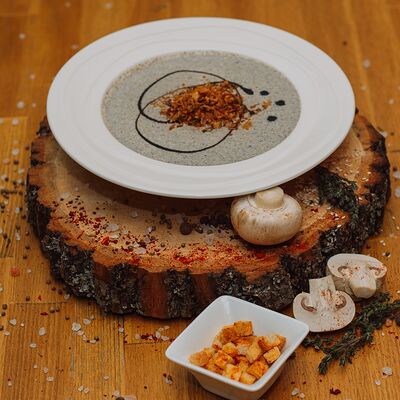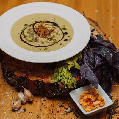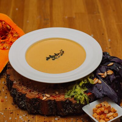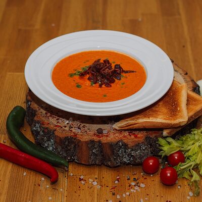 Пряный и нежный крем-суп из томатов, с добавлением сливок, сельдерея, морковки, лука и чеснока, соуса песто и прованских трав. Подается с хрустящим беконом и поджаренным тостом