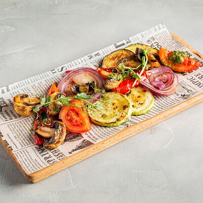 Баклажаны, томаты, красный лук, соус сладкий чили, кинза, кунжут