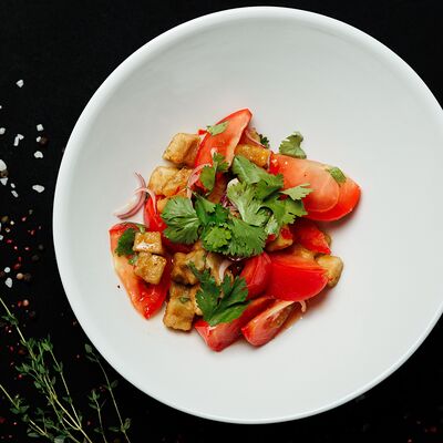 Теплый салат из баклажанов с томатами доставка