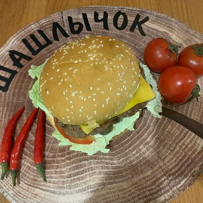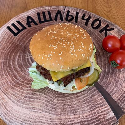 Бургер на белой булке с котлетой из говядины, приготовленной на углях, салат, сыр, томат, солёные огурцы, заправлено соусами собственного производства