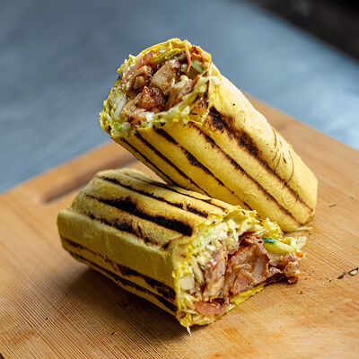 Лаваш, куриное филе, капуста пекинская, морковь по-корейски, свежие огурцы и помидоры, соус бело-красный