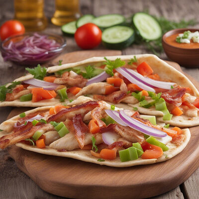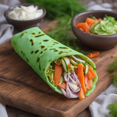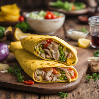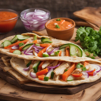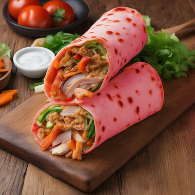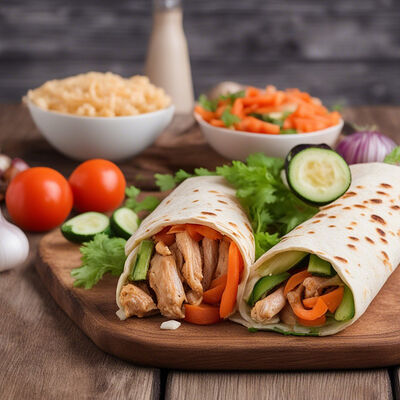 Нежная курочка, свежие овощи (морковь, капуста, огурчики, помидоры, лучок), фирменный соус, лаваш томатный