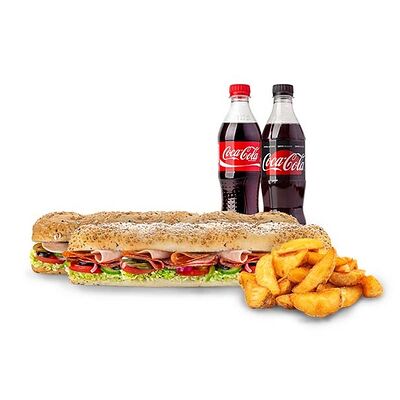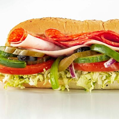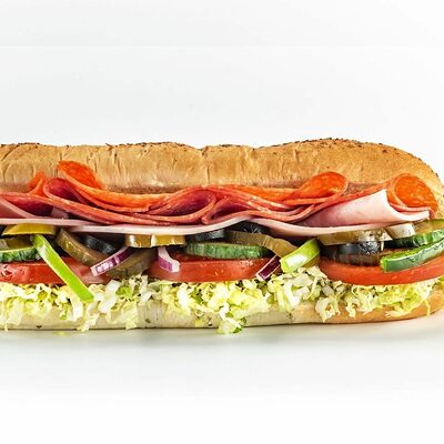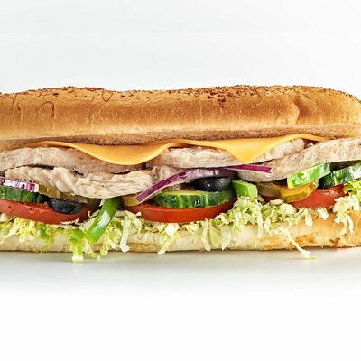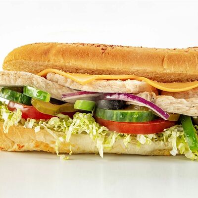 Начинка из бекона, индейки и ветчины с сыром на свежевыпеченном хлебе в комбинации с овощами и соусом на выбор