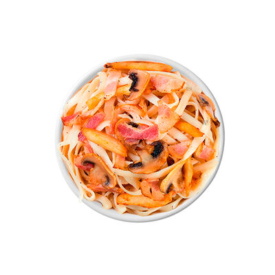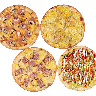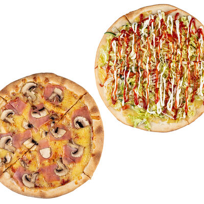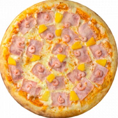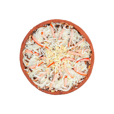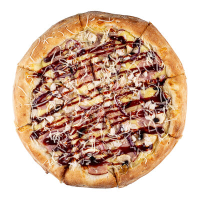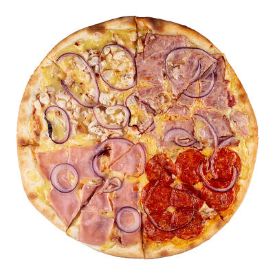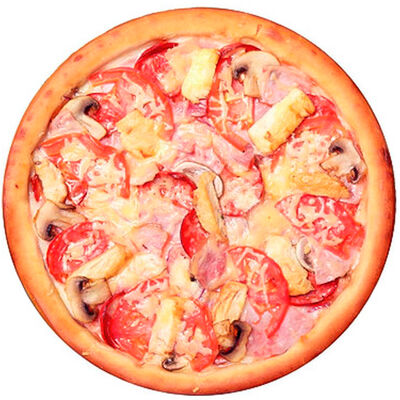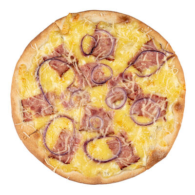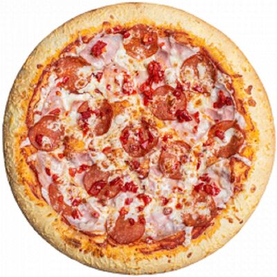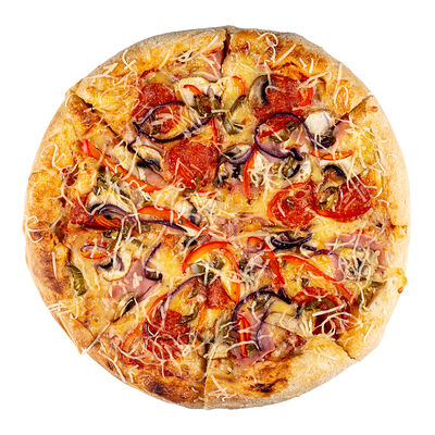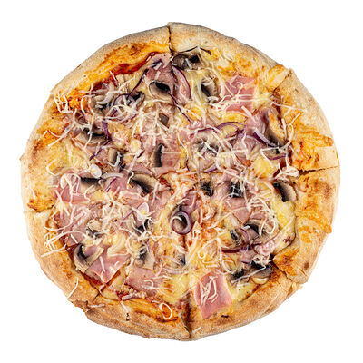 Ветчина, пепперони, сыр моцарелла, шампиньоны, перец халапеньо, соус для пиццы, пышное тесто, паприка, сыр пармезан, лук красный (30 см)