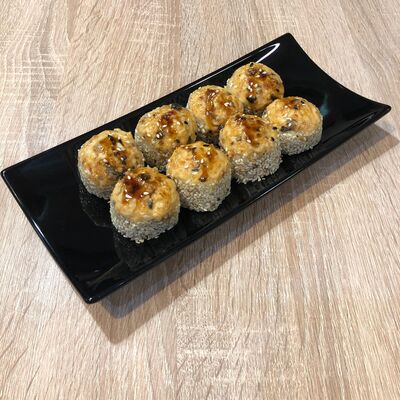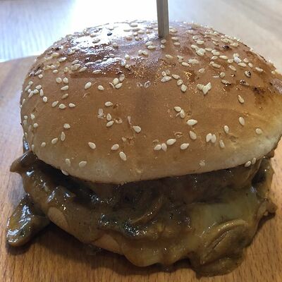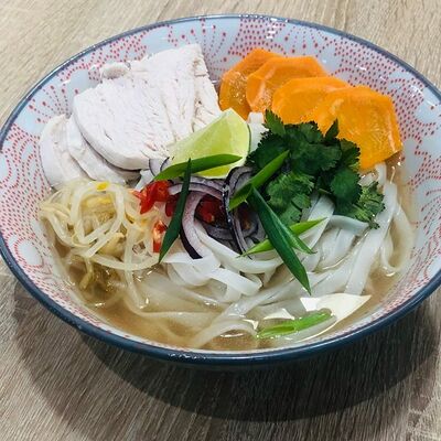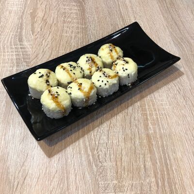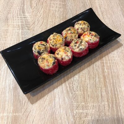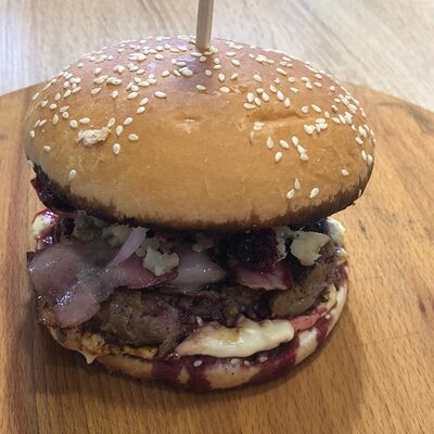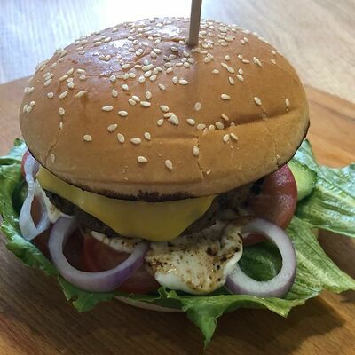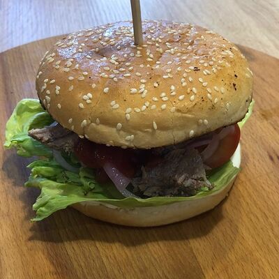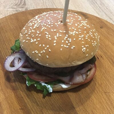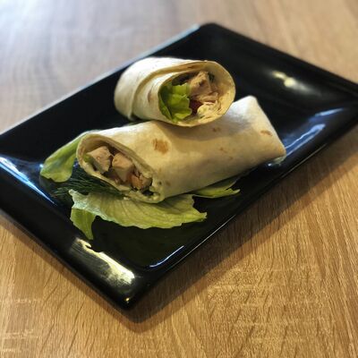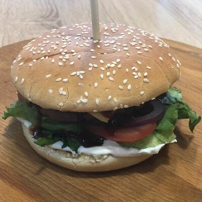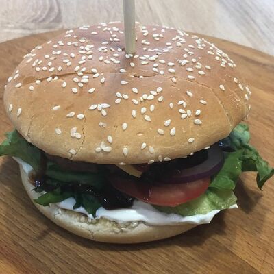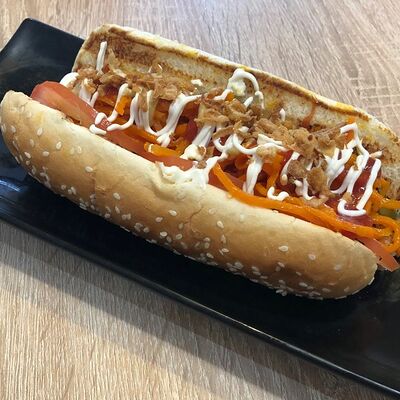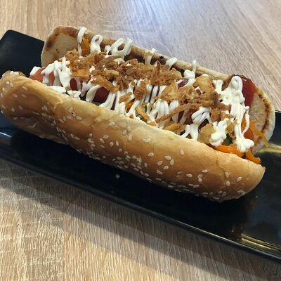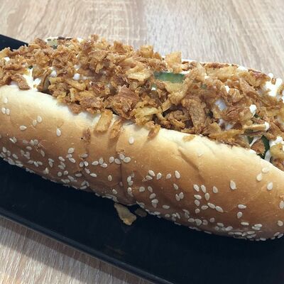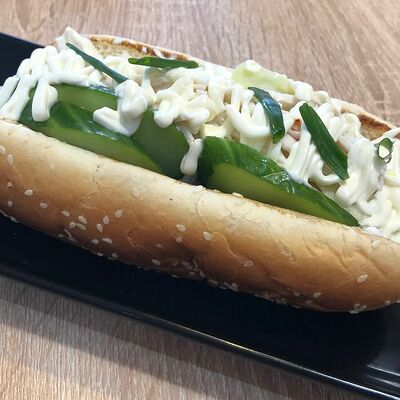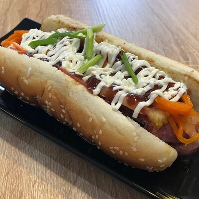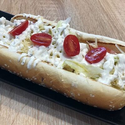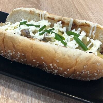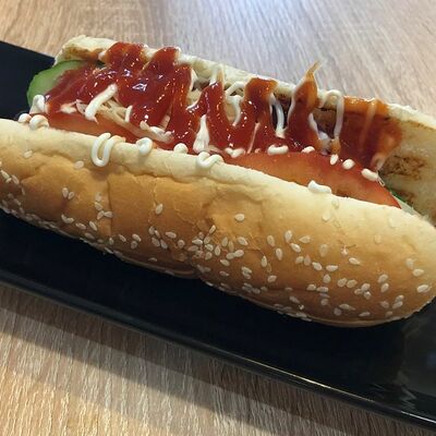 Булка, колбаска Куриная, огурцы свежие, томат, лук красный, кетчуп, соус барбекю, соус белый, пармезан