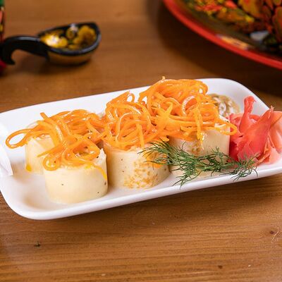Блины, яйцо, майонез, огурец, морковь по-корейски, горчица, имбирь