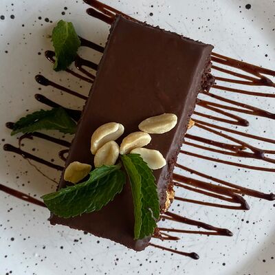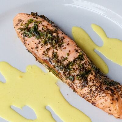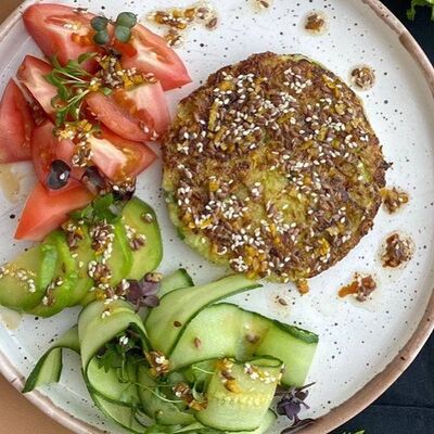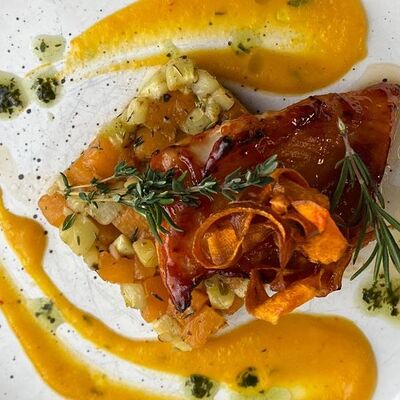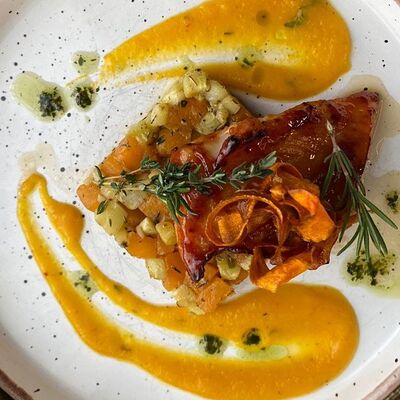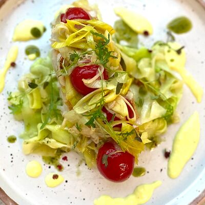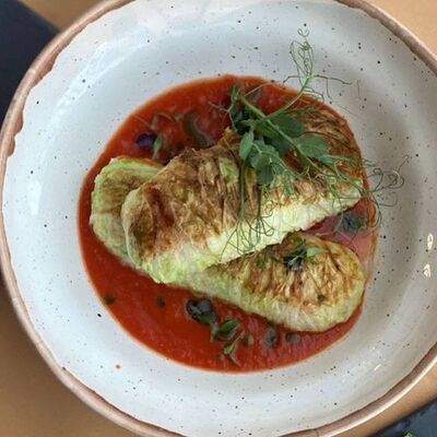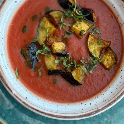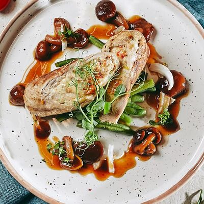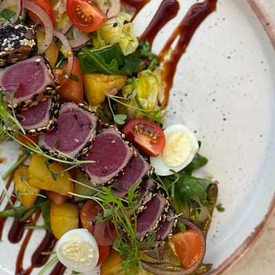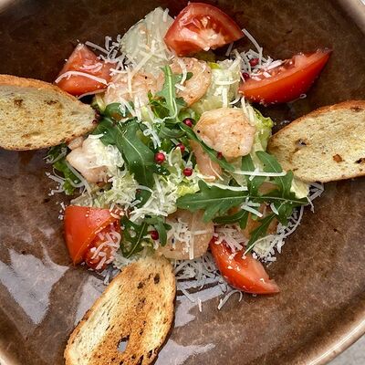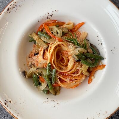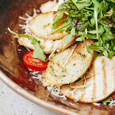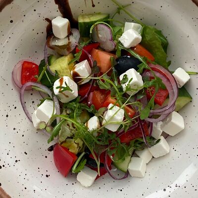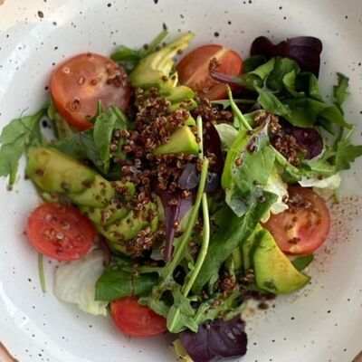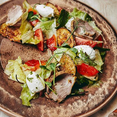 Микс салатов, печеный болгарский перец, томаты, твороженный сыр, соус песто, буженина, баклажан