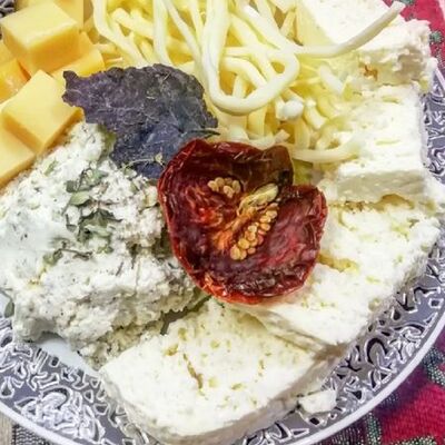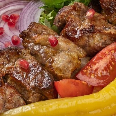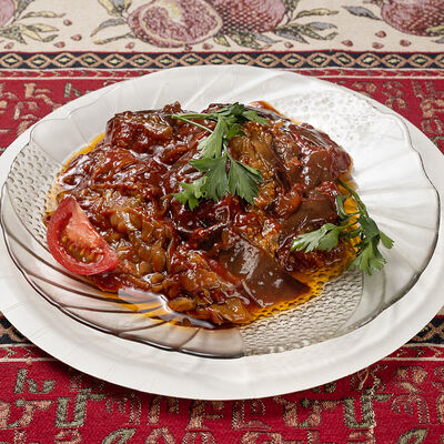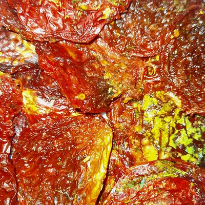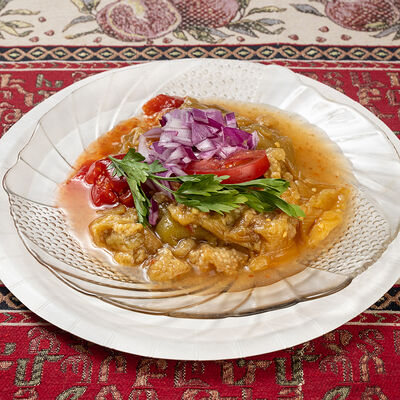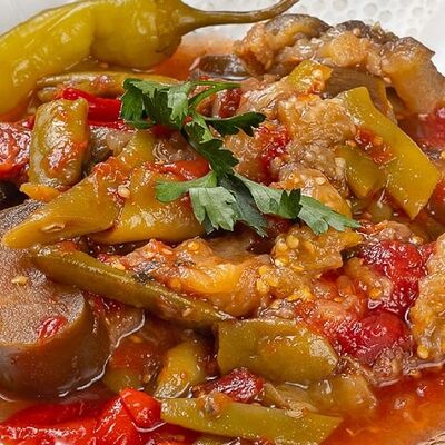 Тушеные баклажаны, перец, помидоры, лук, зелень