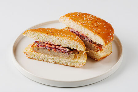 Бургер с котлетой из курицы и креветок с овощами доставка