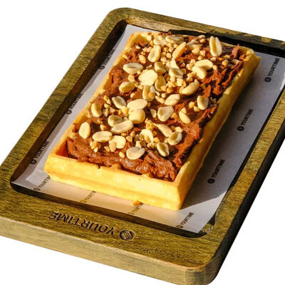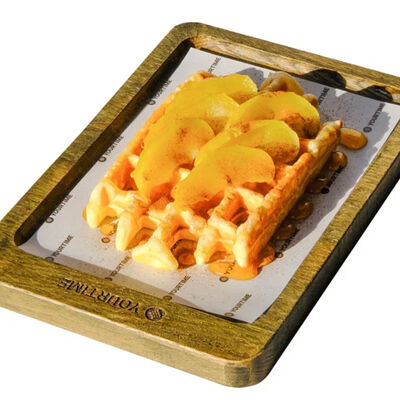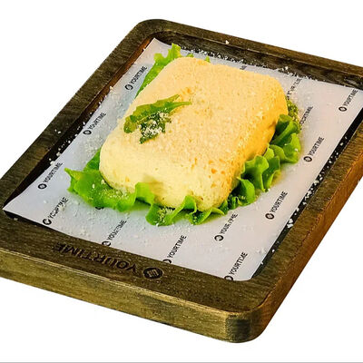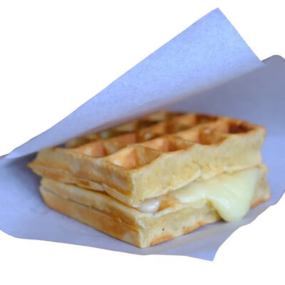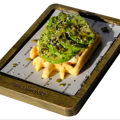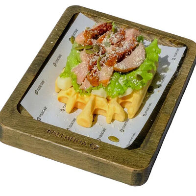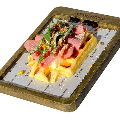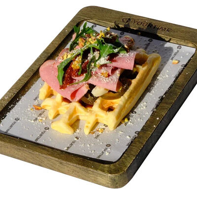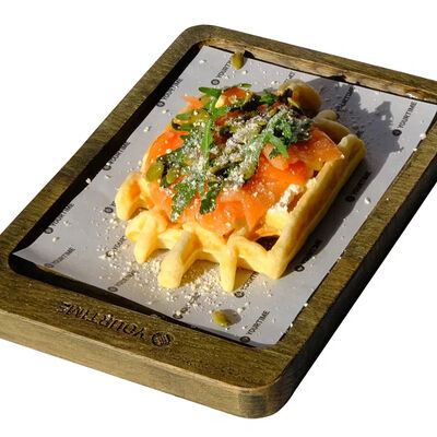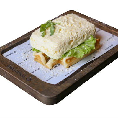 Вафля (мука пшеничная, сахар, яичный порошок, крахмал кукурузный, молоко сухое, разрыхлитель, соль), яйцо, молоко, лист салата, соль, творожный сыр, руккола, сыр пармезан