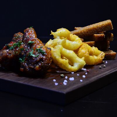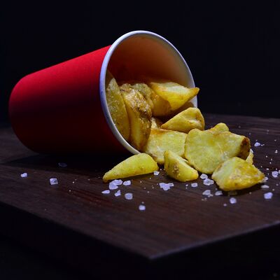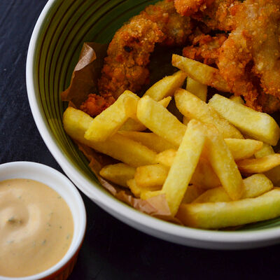 Стрипсы из судака с картофелем фри и соусом острый майонез
