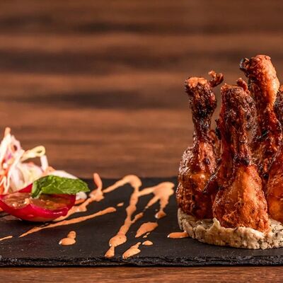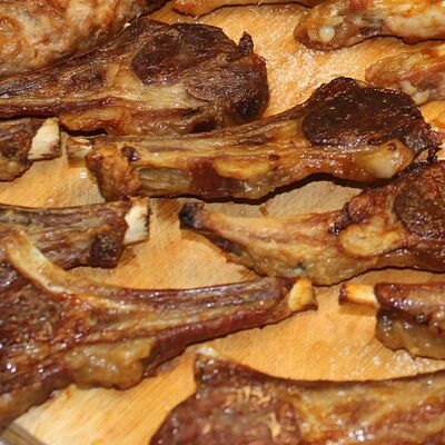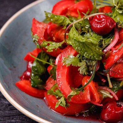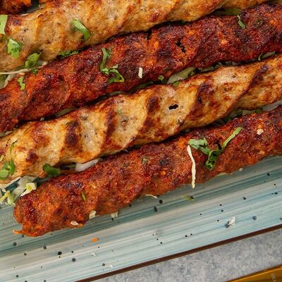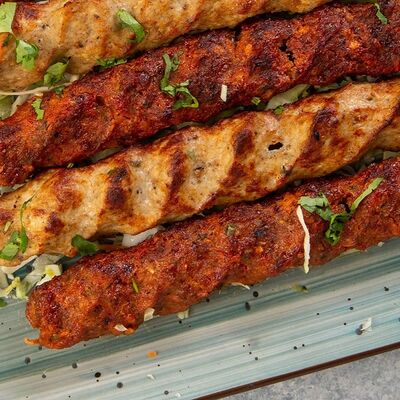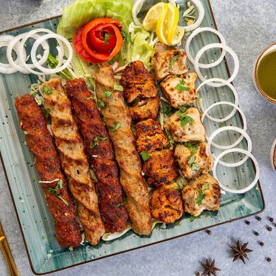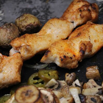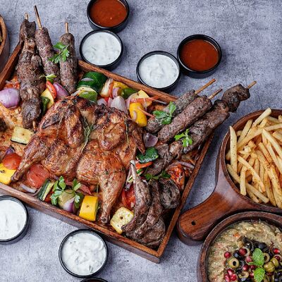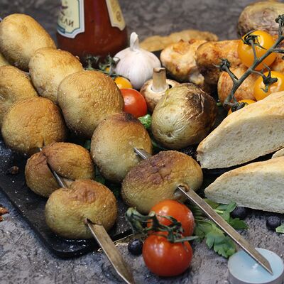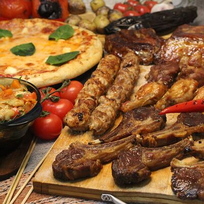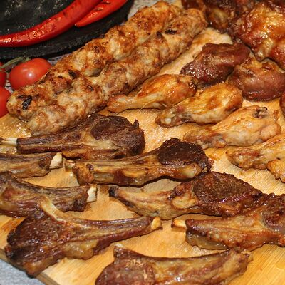 Люля-кебаб из баранины, помидор гульканд, картошка фри, болгарский перец на углях, грибы шампиньоны на углях, лук, зелень, соусы