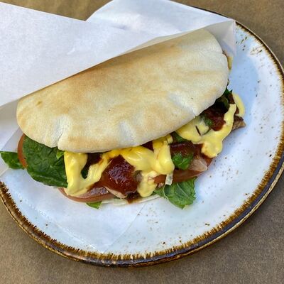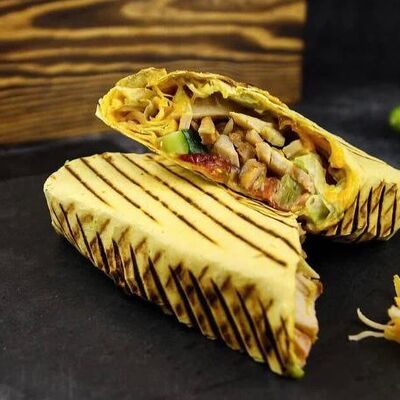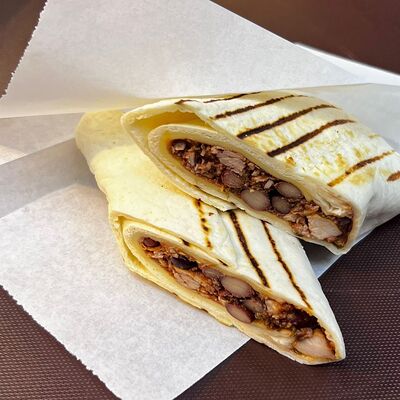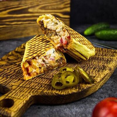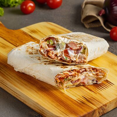 Лепешка донер, сырный соус, фирменный томатный соус, картофель, курица (халяль), помидоры свежие