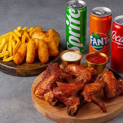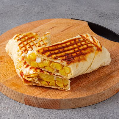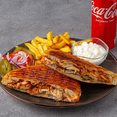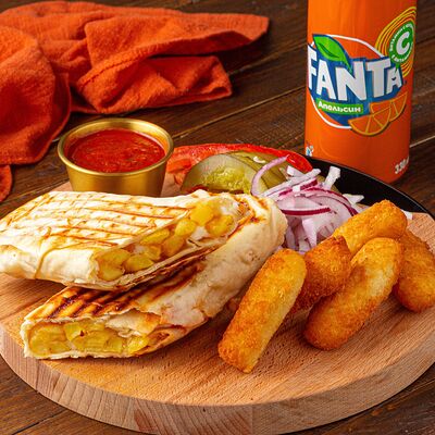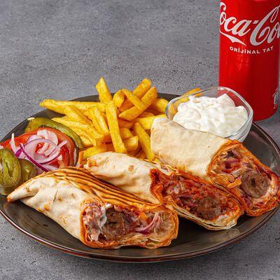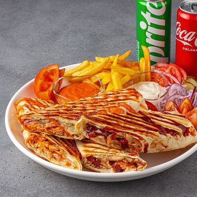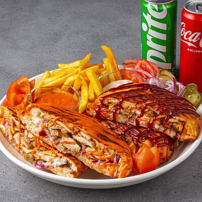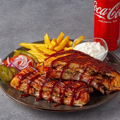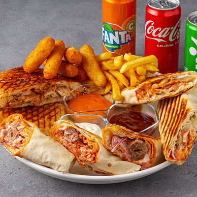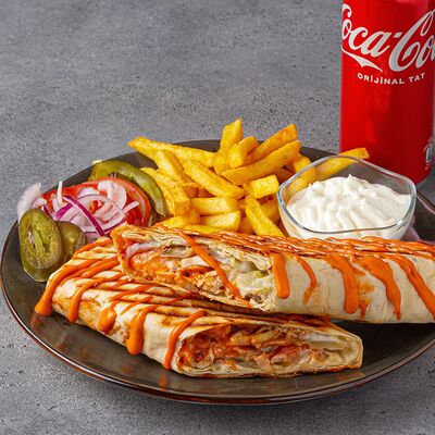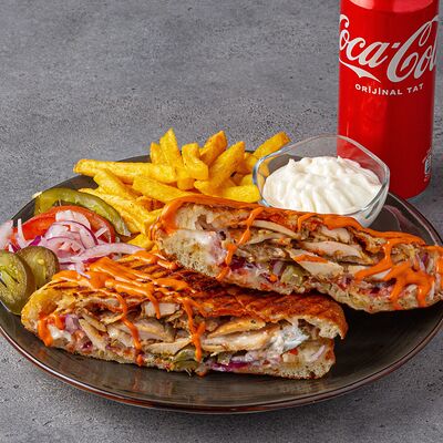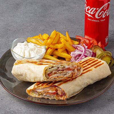 Тандырные лепешки, говядина, пекинский салат, огурцы, помидоры, соленые огурцы, авторский арабский соус (белый), томатный соус, картофель фри (100 г), Coca-Cola (300 мл)