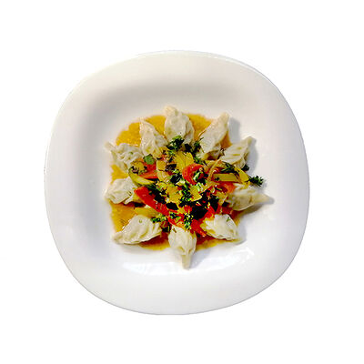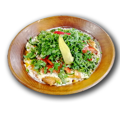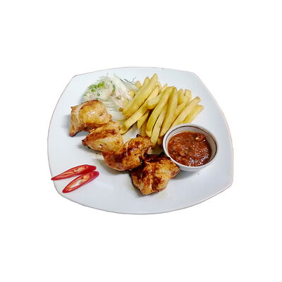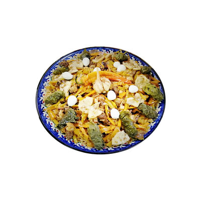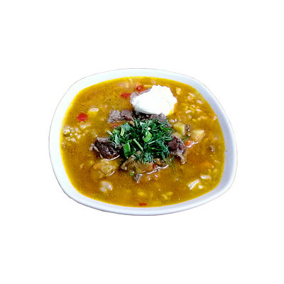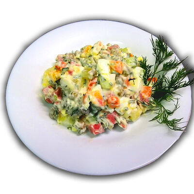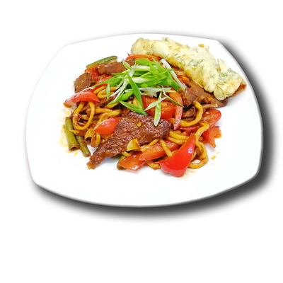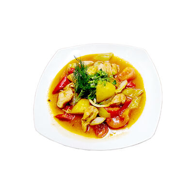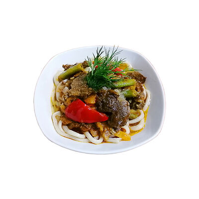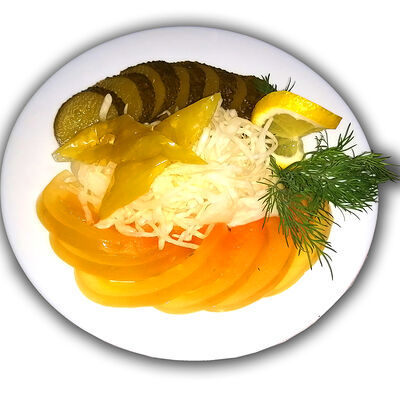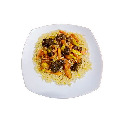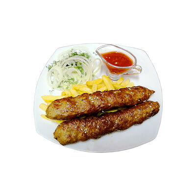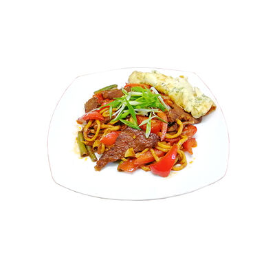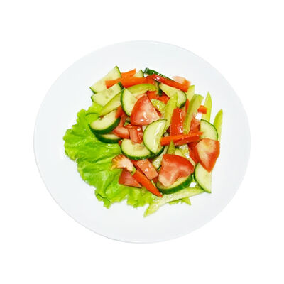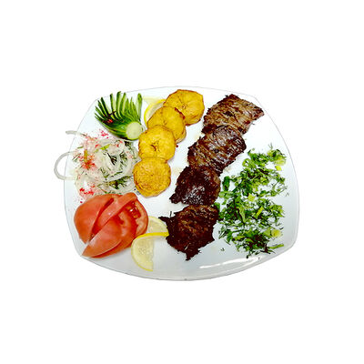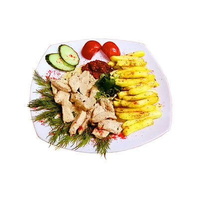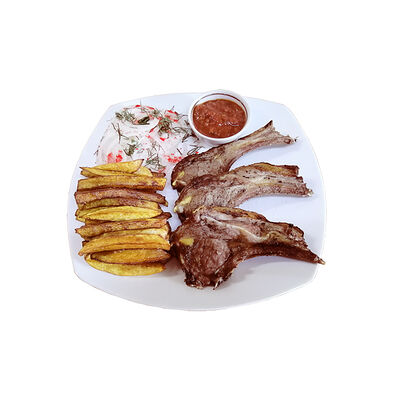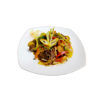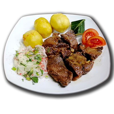 Баранина, картофель жареный, лук свежий, огурцы и помидоры