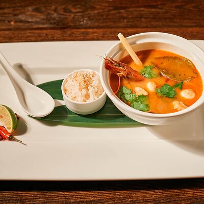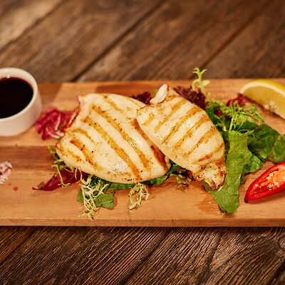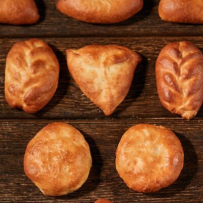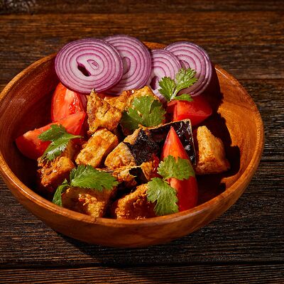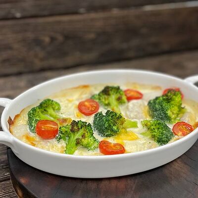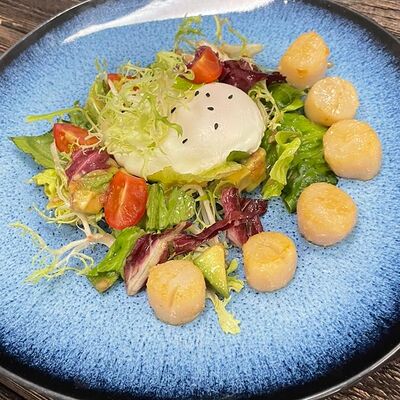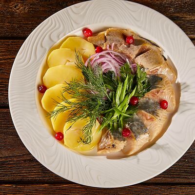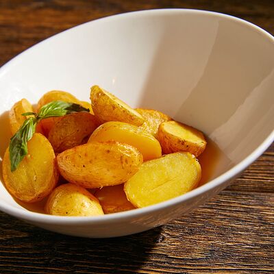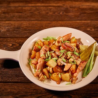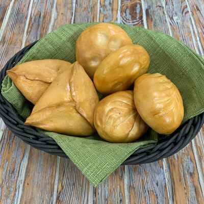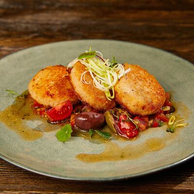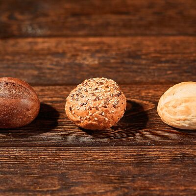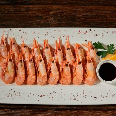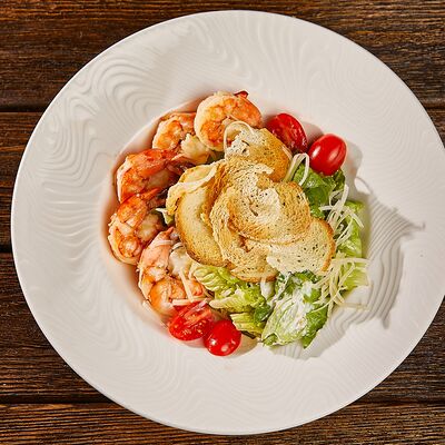 Картофельная булочка, креветки, листья салата, лук, помидоры, сыр