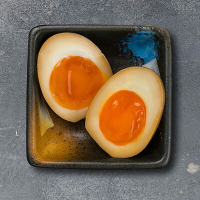 Бульон том ям, лапша рамен, креветки тигровые, яйцо маринованное, шампиньоны, лайм, лук зелёный, кинза, нарутомаки