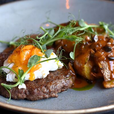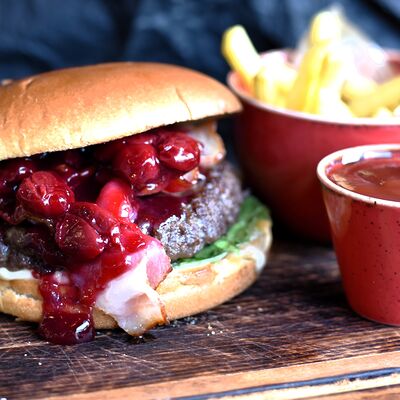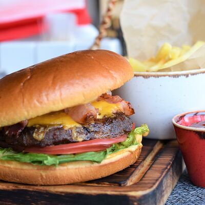 С котлетой из говядины блэк ангус, беконом, сыром чеддер, романо и соусом гриль. Подается с картофелем фри и кетчупом