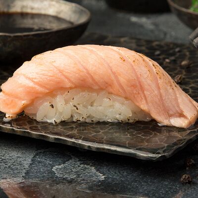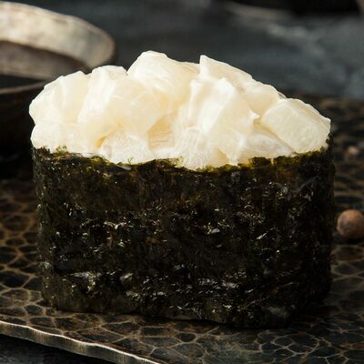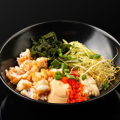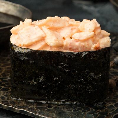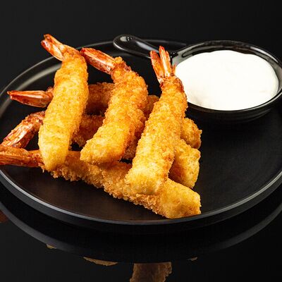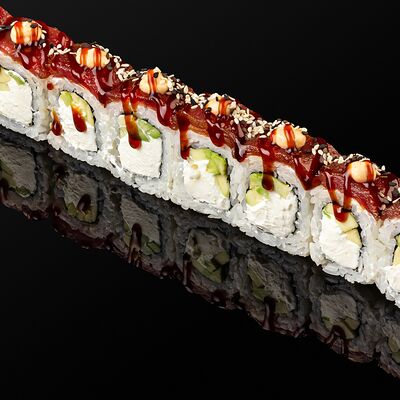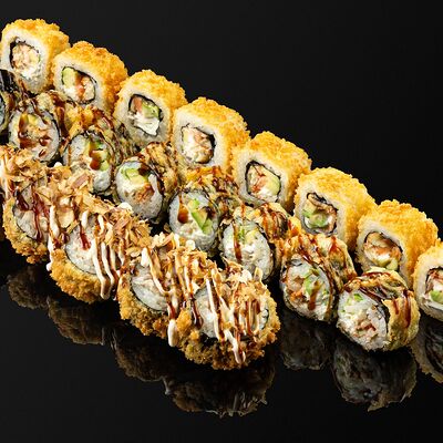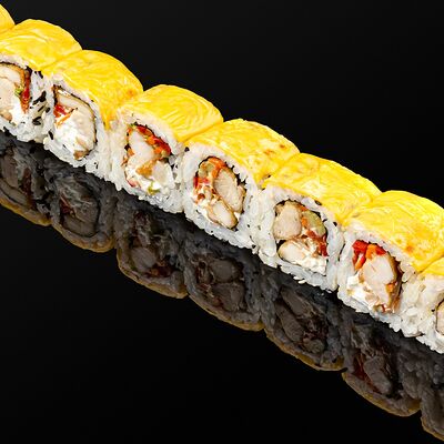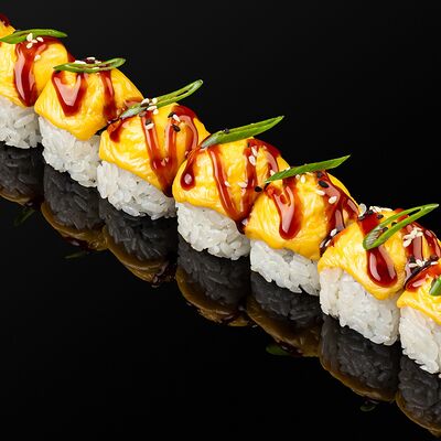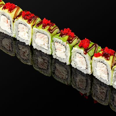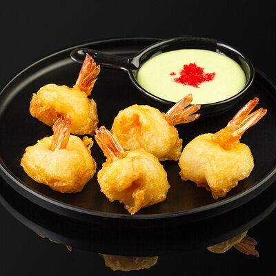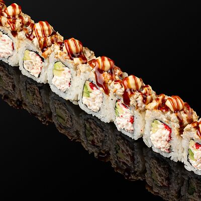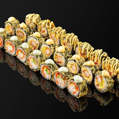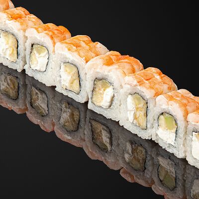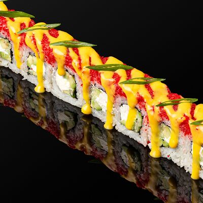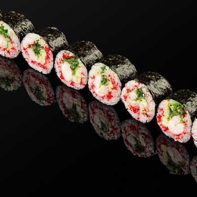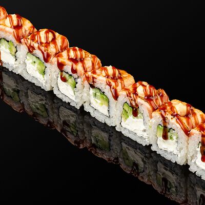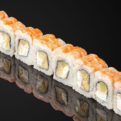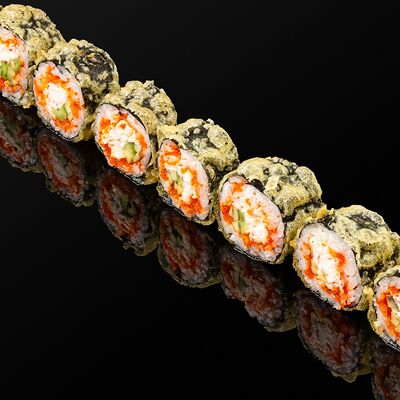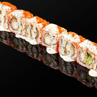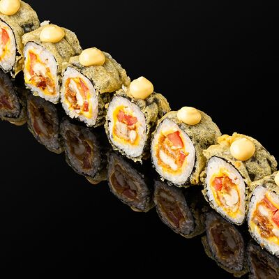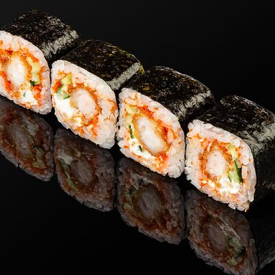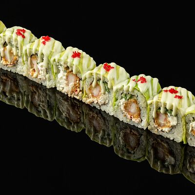 Креветки в темпуре, авокадо, сыр, маменори, лук-порей, соус микс, сок юдзу, нори