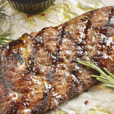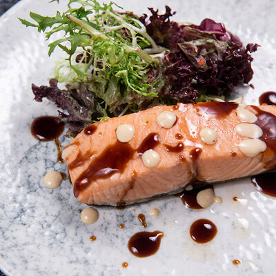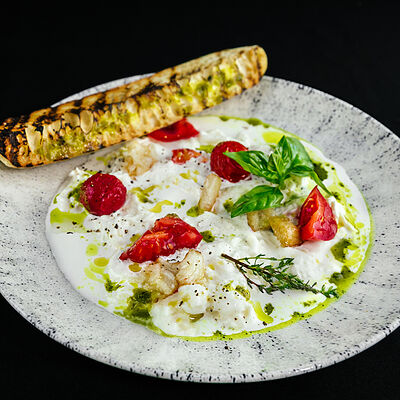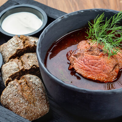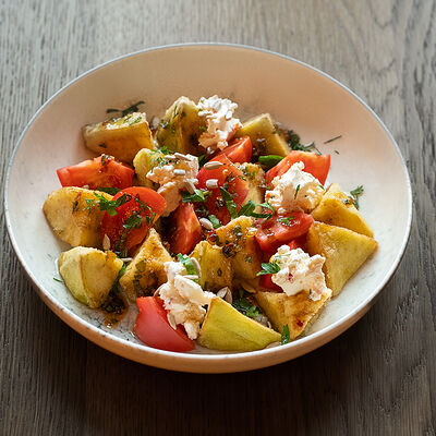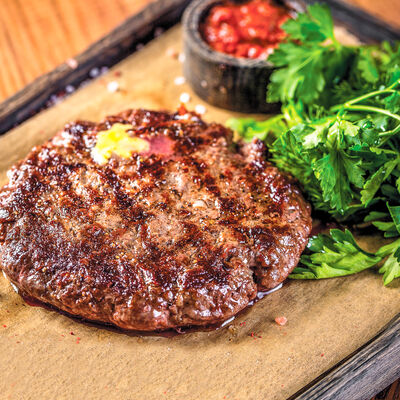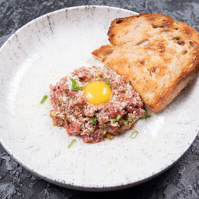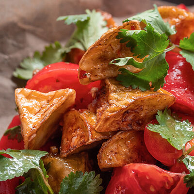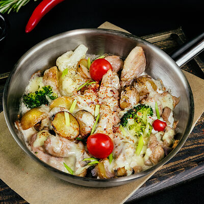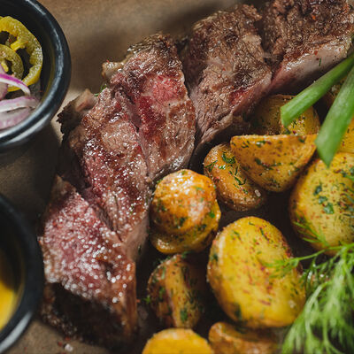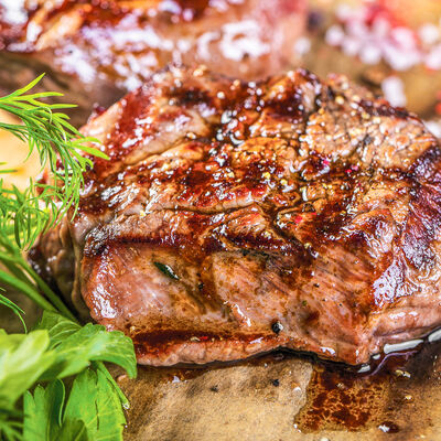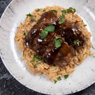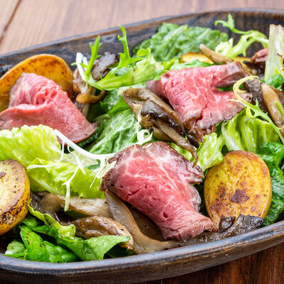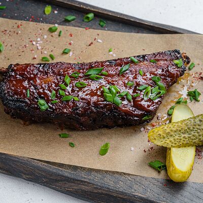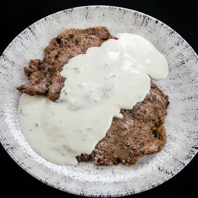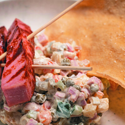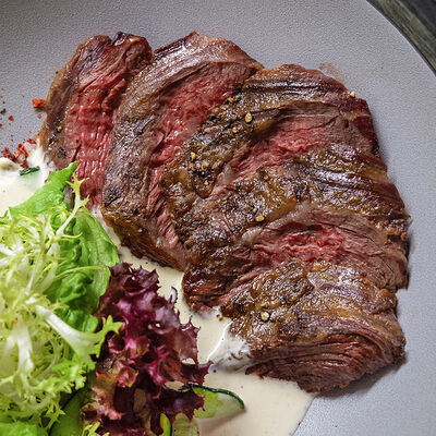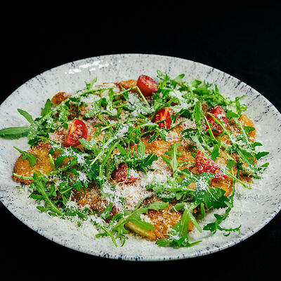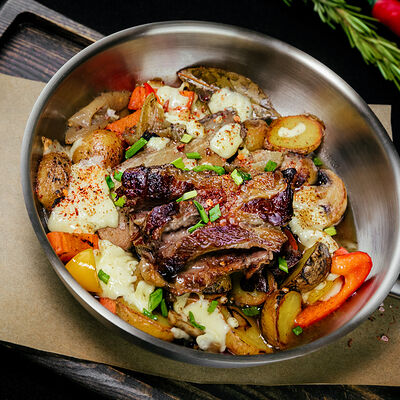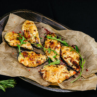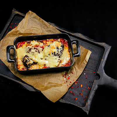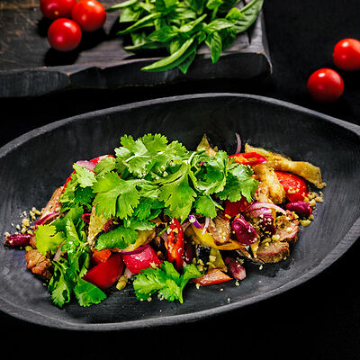 Баклажаны, крахмал, соус лечо, томленые говяжьи щечки