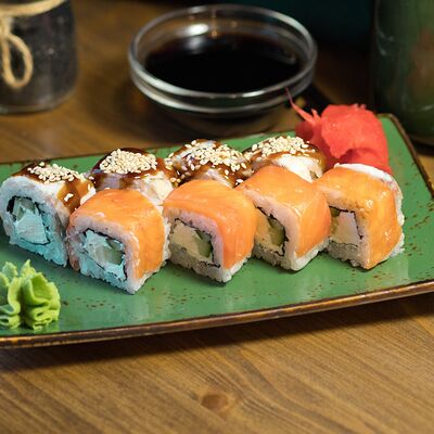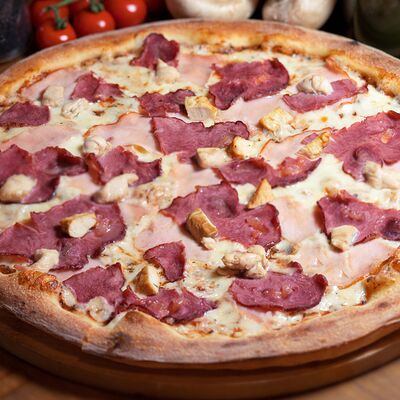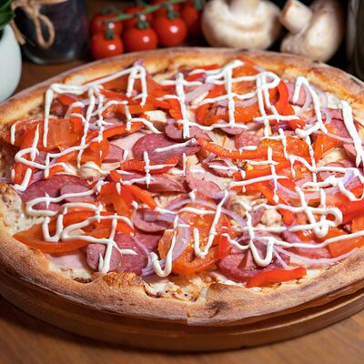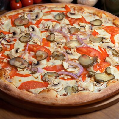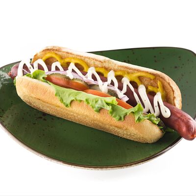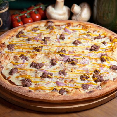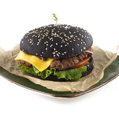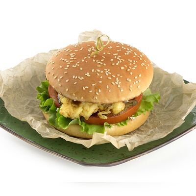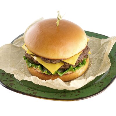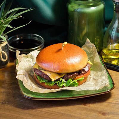 Мягкая булочка бриошь, сочная котлета из мраморной говядины, фирменный соус, сыр чеддер, свежий салат айсберг, свежий помидор, красный лук, маринованные огурцы