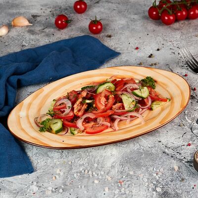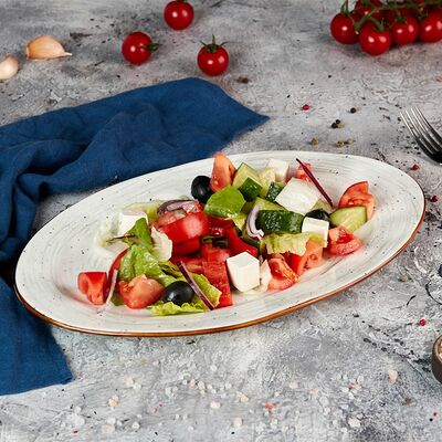 Огурцы свежие, помидор, сыр фетакса, оливки, масло оливковое, айсберг