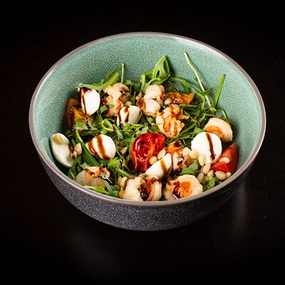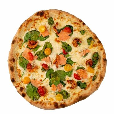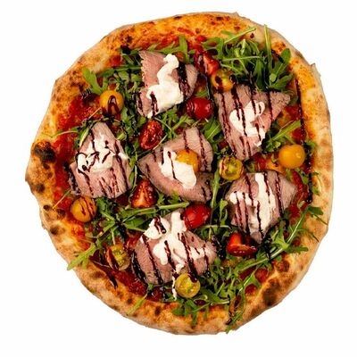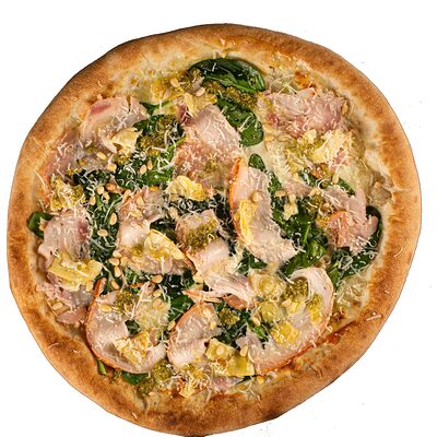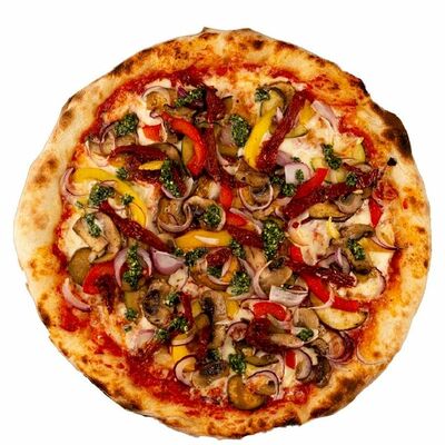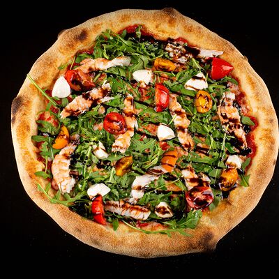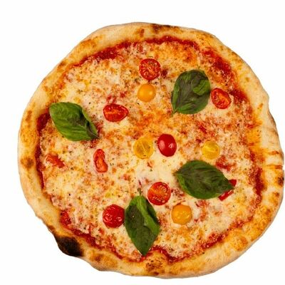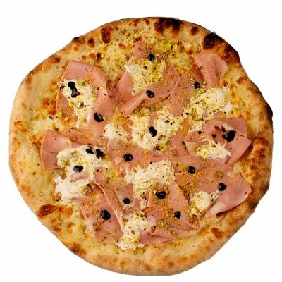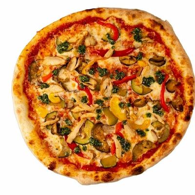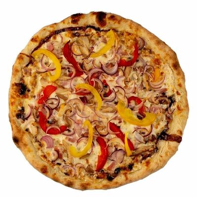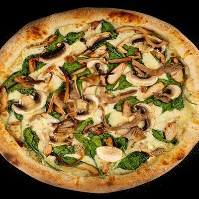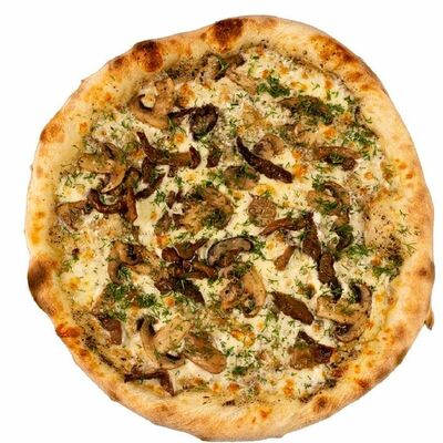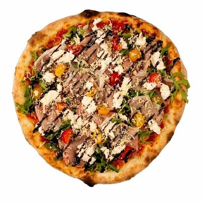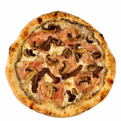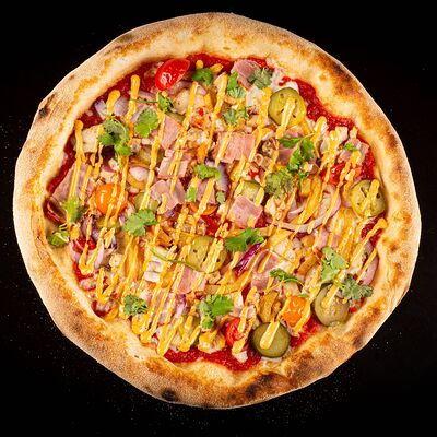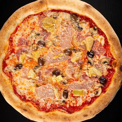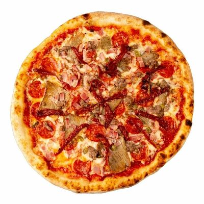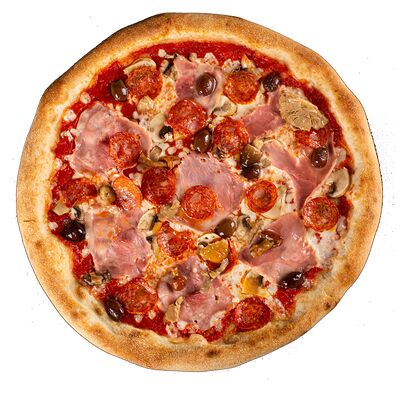 Тесто, томатный соус, сыр моцарелла, ветчина котто, грибной микс, чоризо, оливки, шампиньоны