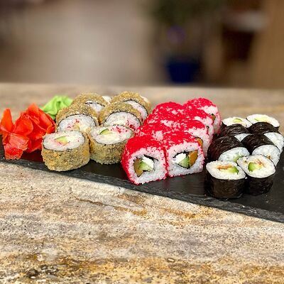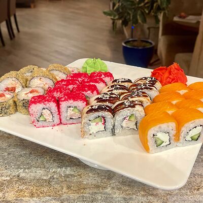 Ролл краб темпура, ролл лосось темпура, ролл токио с лососем, ролл нежный с курицей