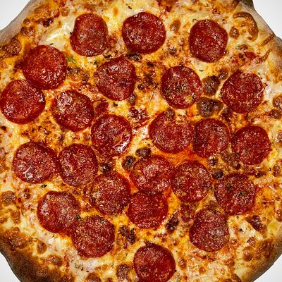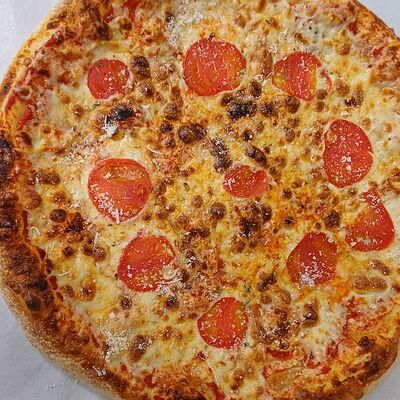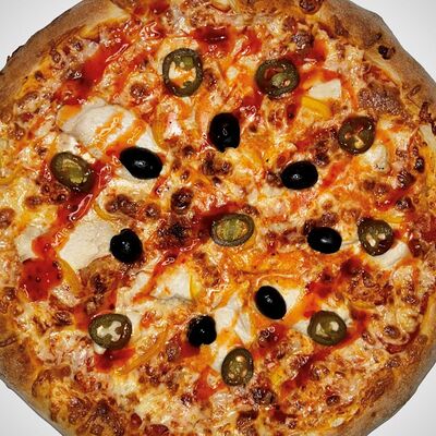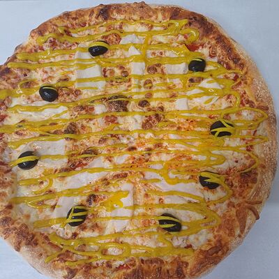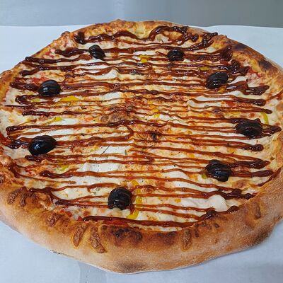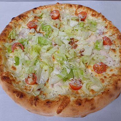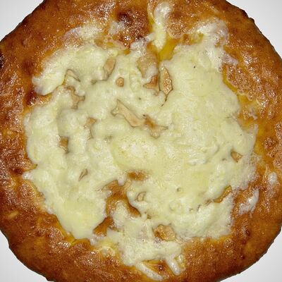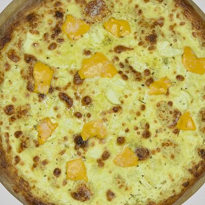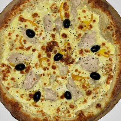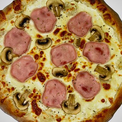 Тонкое домашнее тесто, ветчина индейки, сыр моцарелла, грибы, сливочно-чесночный соус - 35 см