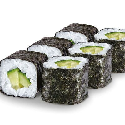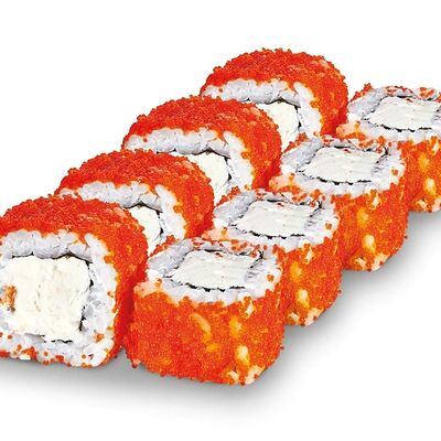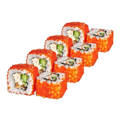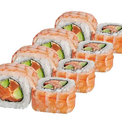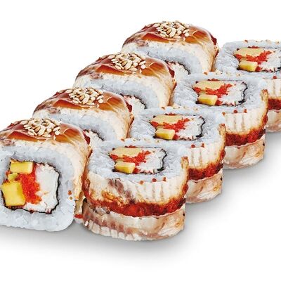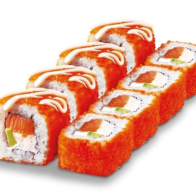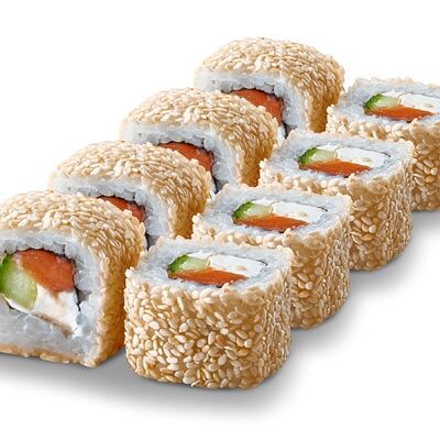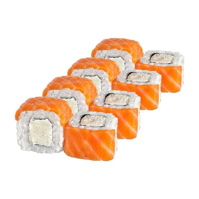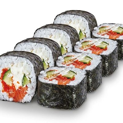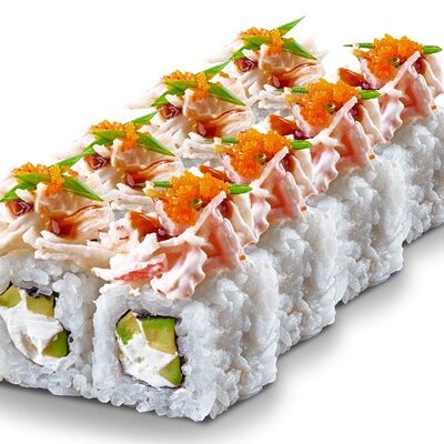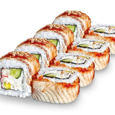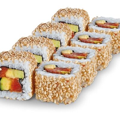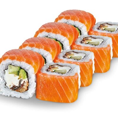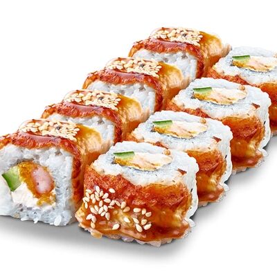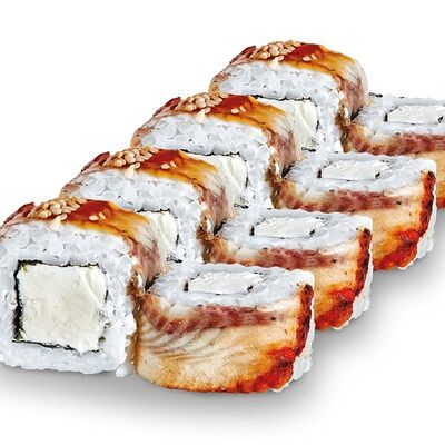 Рис, нори, лосось, сыр сливочный, авокадо, соус унаги, кунжут, лук зеленый