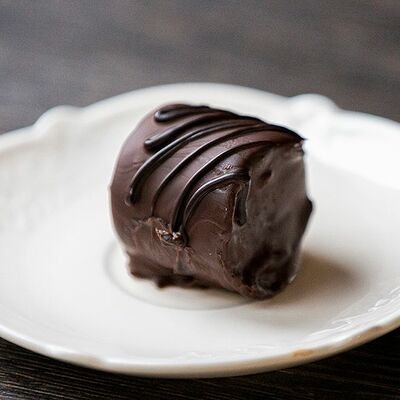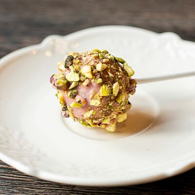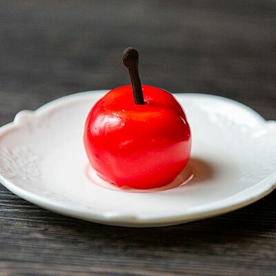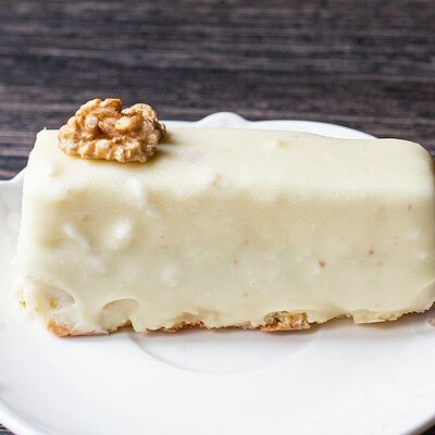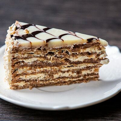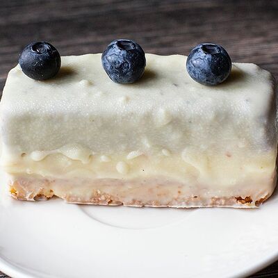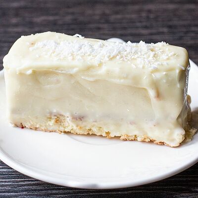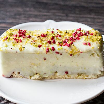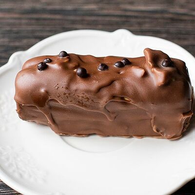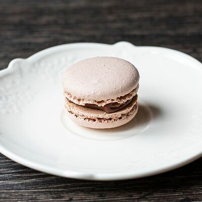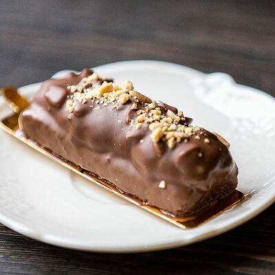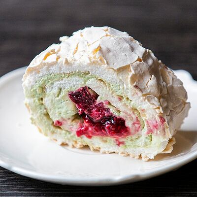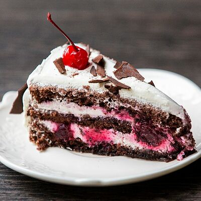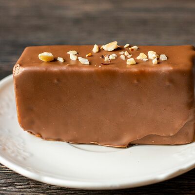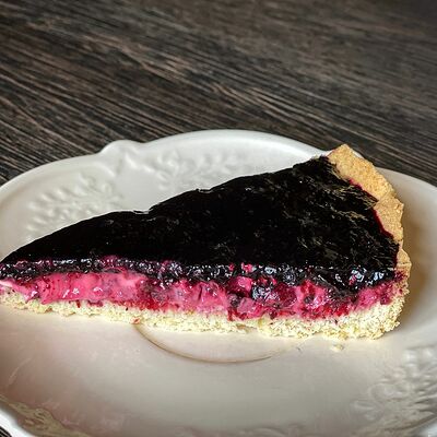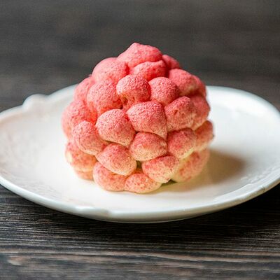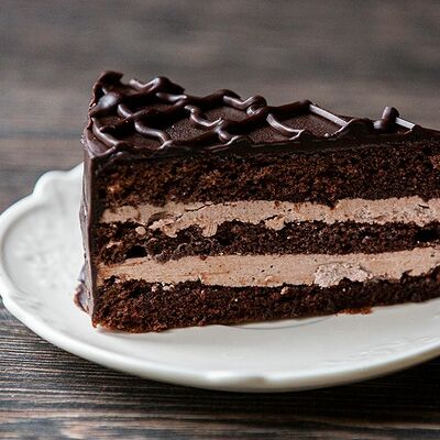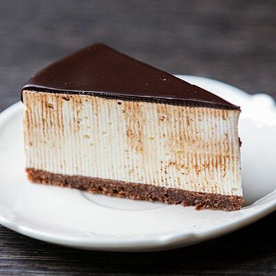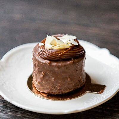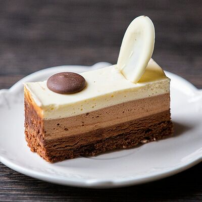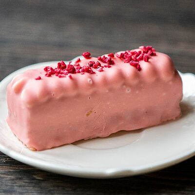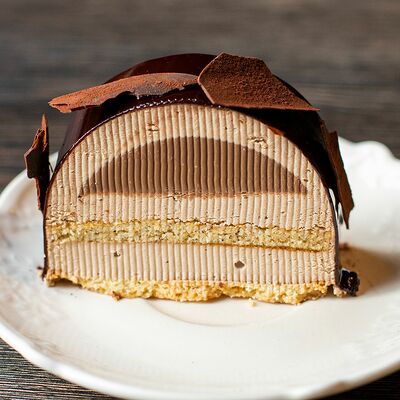 Миндально-малиновый бисквит, сливочный малиновый мусс, муссна основе маскарпоне и белого шоколада, шоколадная глазурь