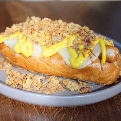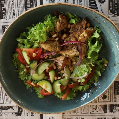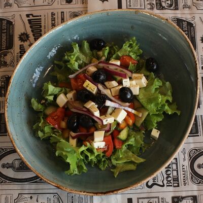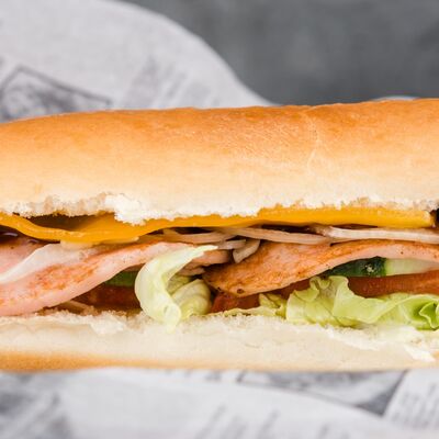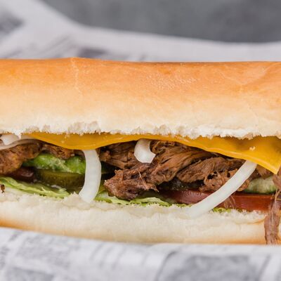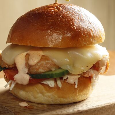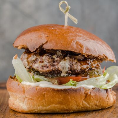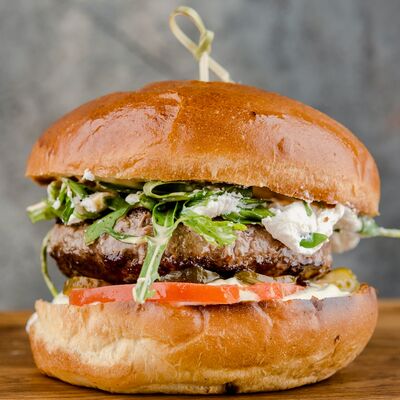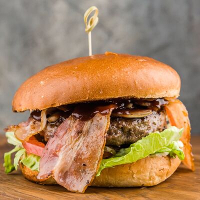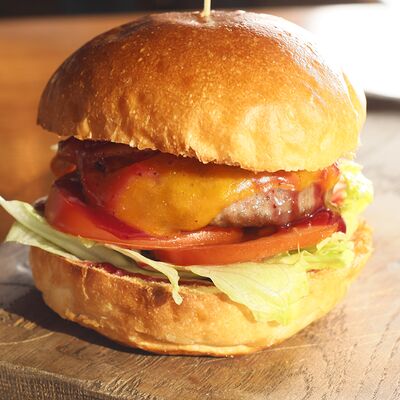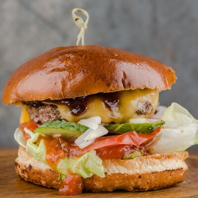 Котлета из мраморной говядины, свежая булочка, зеленый салат, помидоры, двойной сыр чеддер, брусничный соус