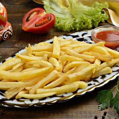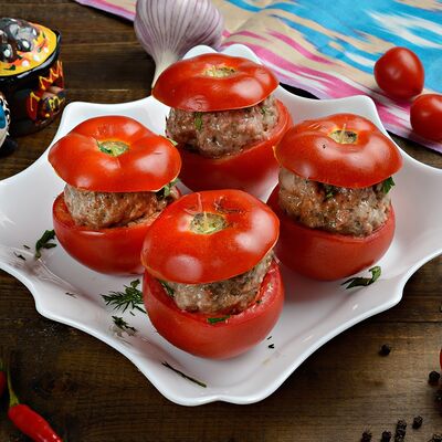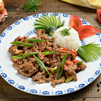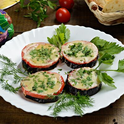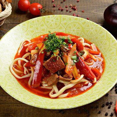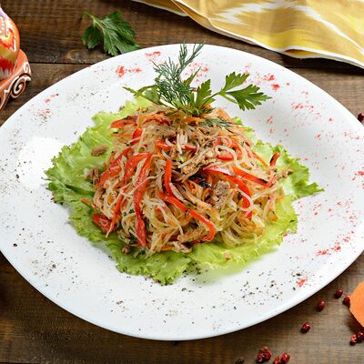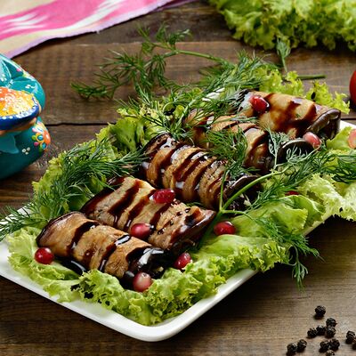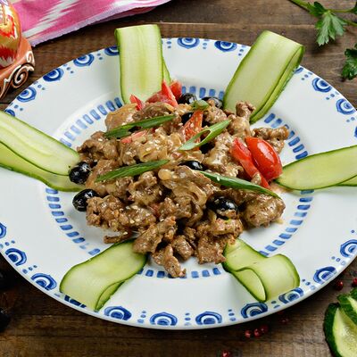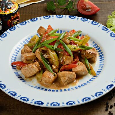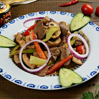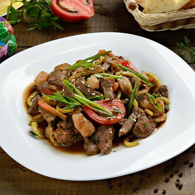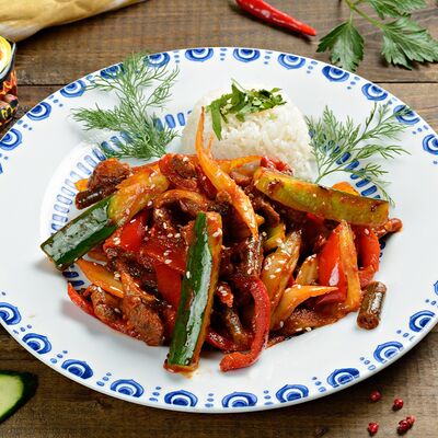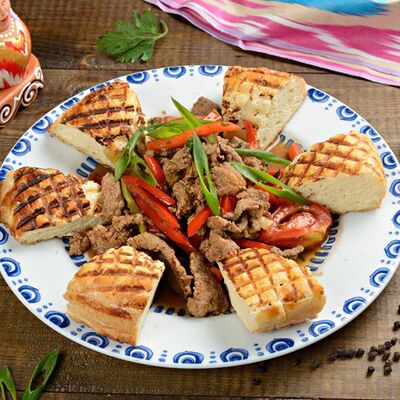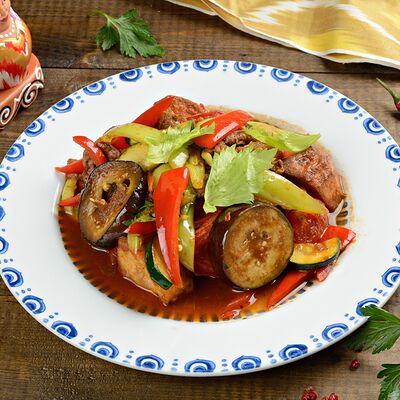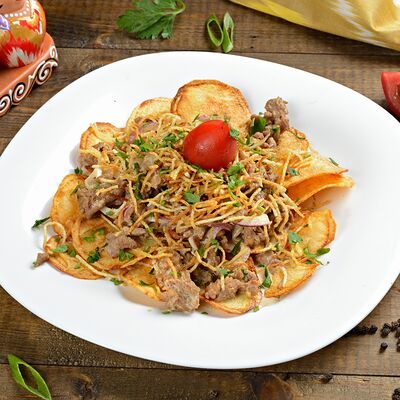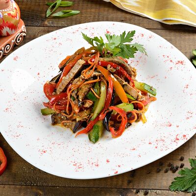 Баклажанный фри, мясо теленка, чеснок зелень, болгарский перец
