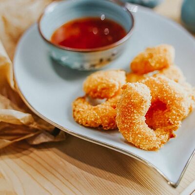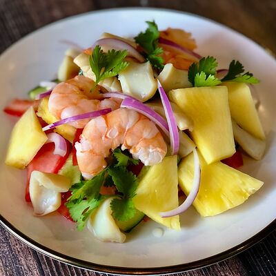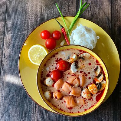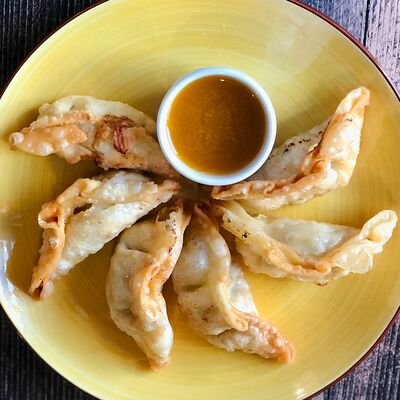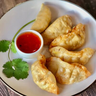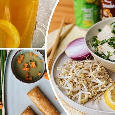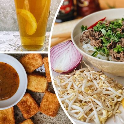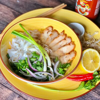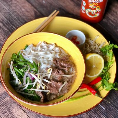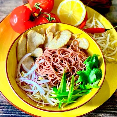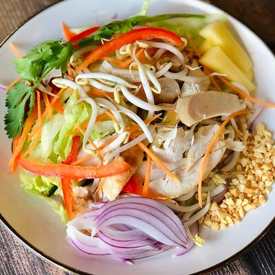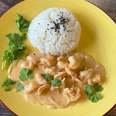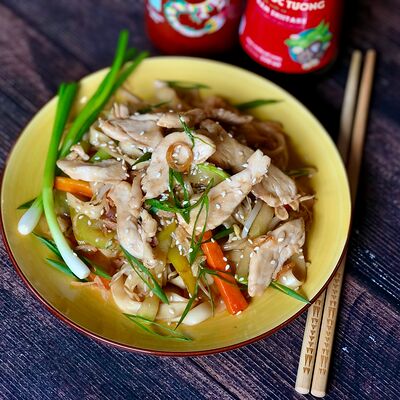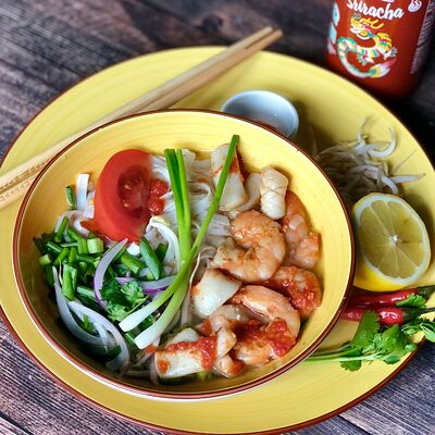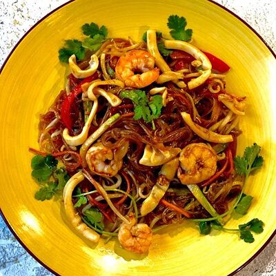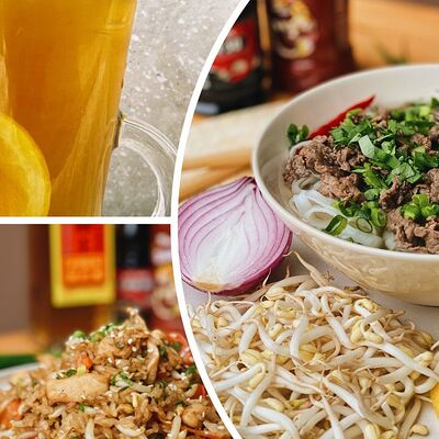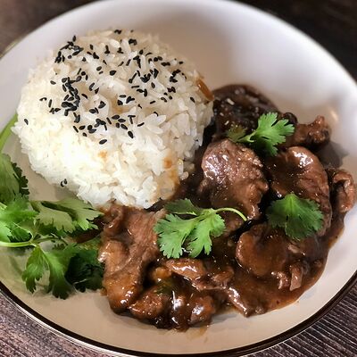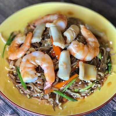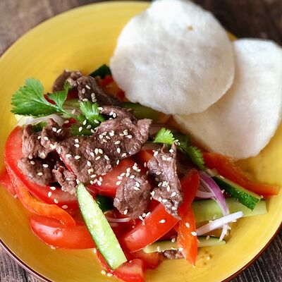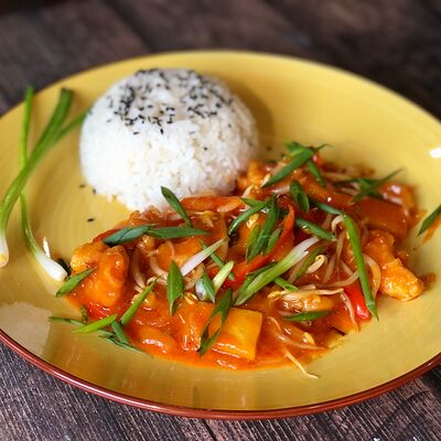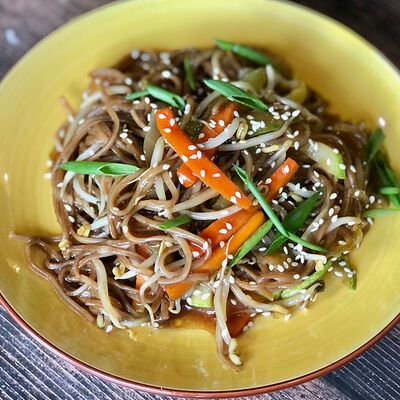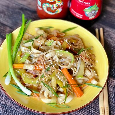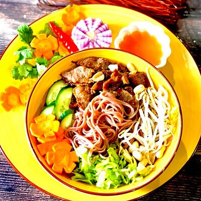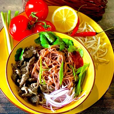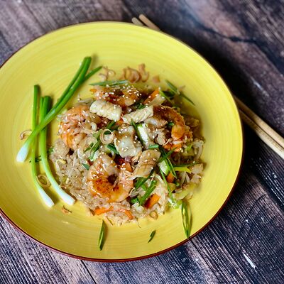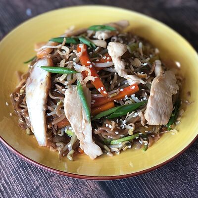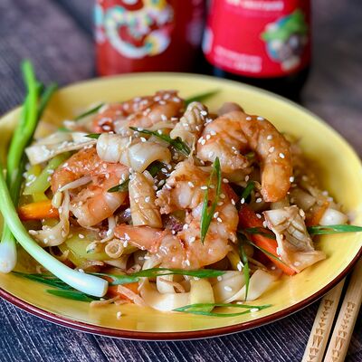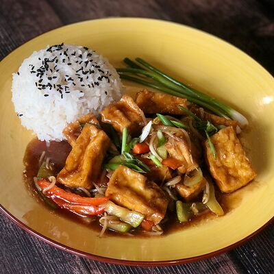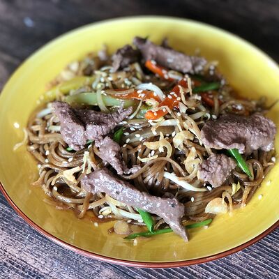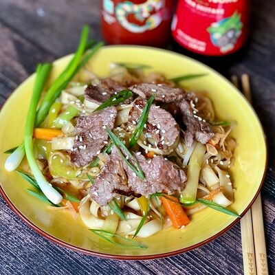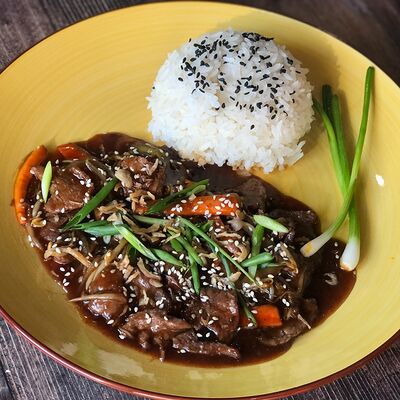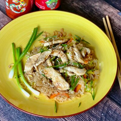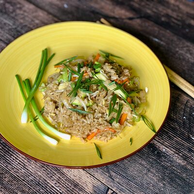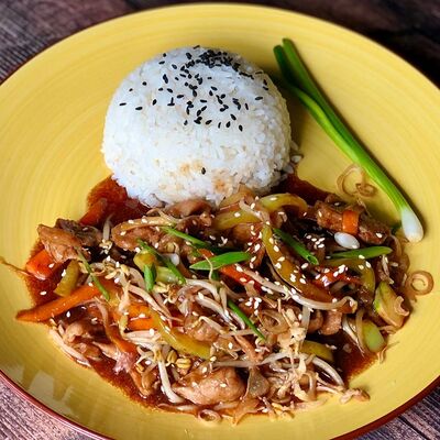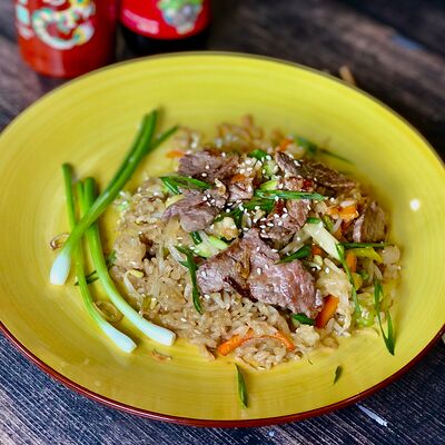 Паровой рис, говядина, перец сладкий, лук репчатый, кабачки, лук зеленый, проростки сои, соевый соус, устричный соус, жареный лук, кунжут белый, имбирное масло, чесночное масло