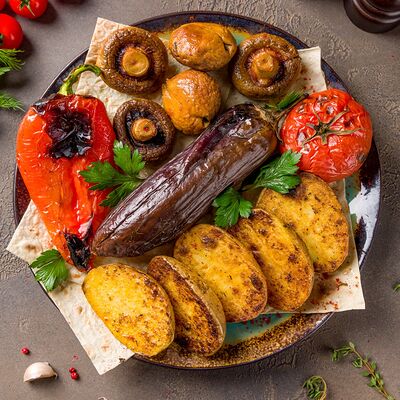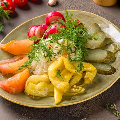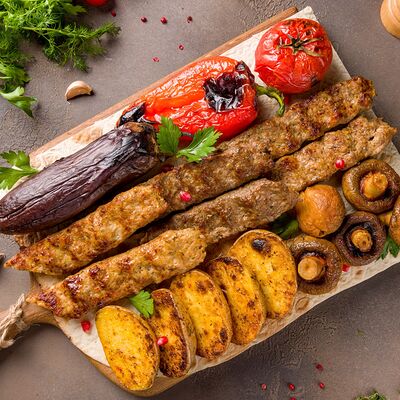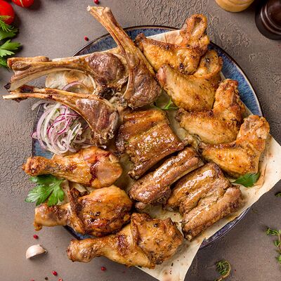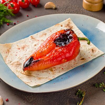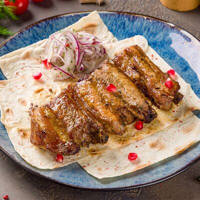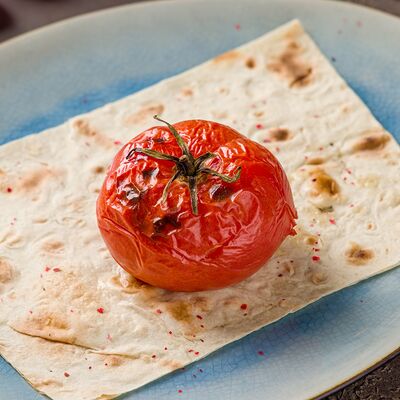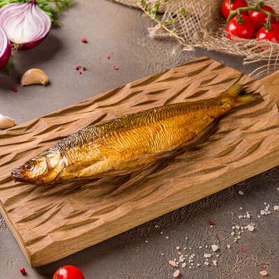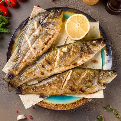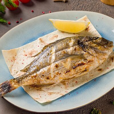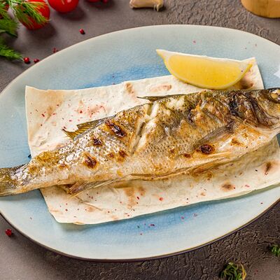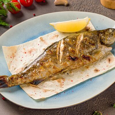 Рыба форель, обжаренная на углях. Подаётся с ломтиком лимона
