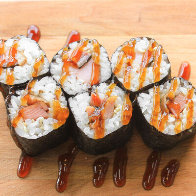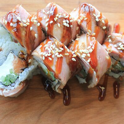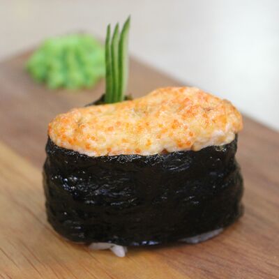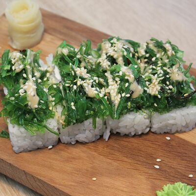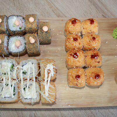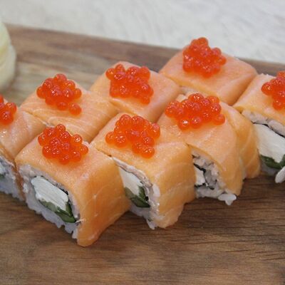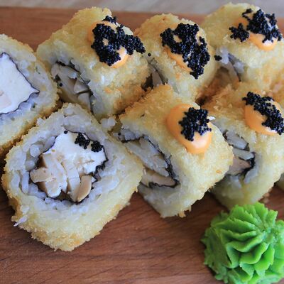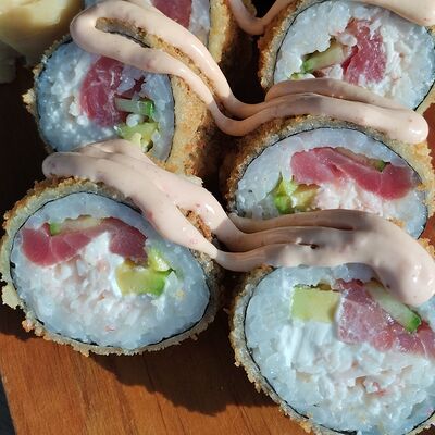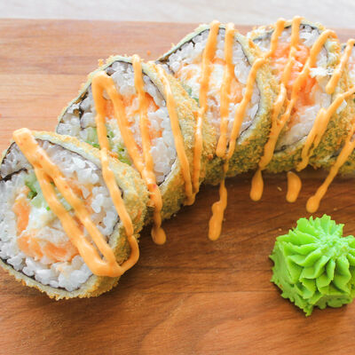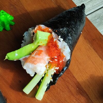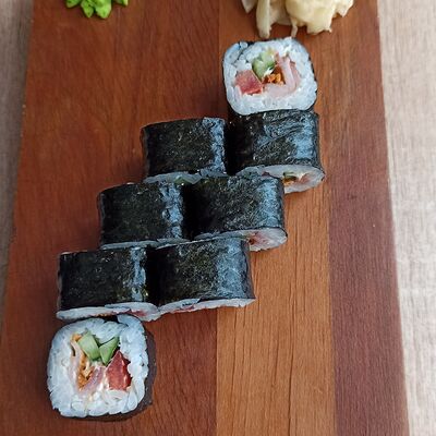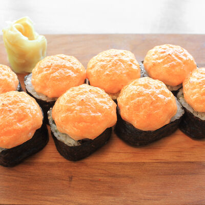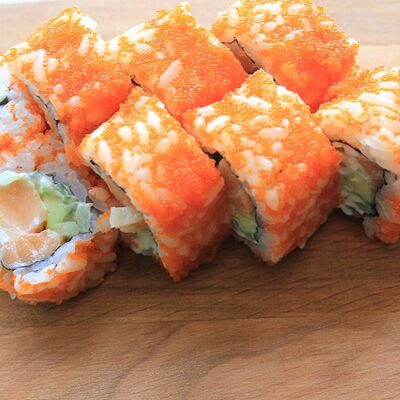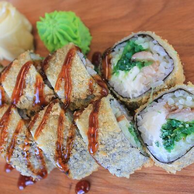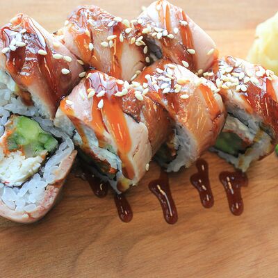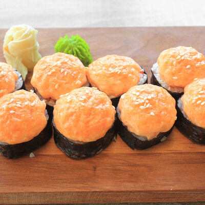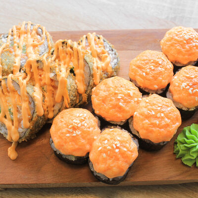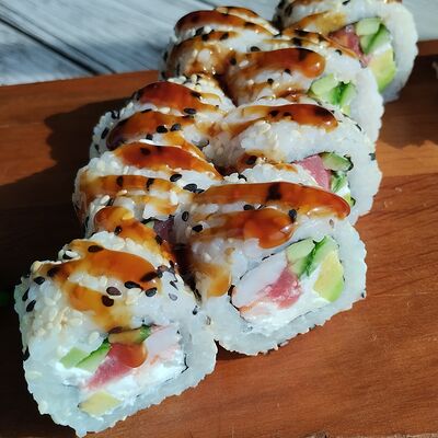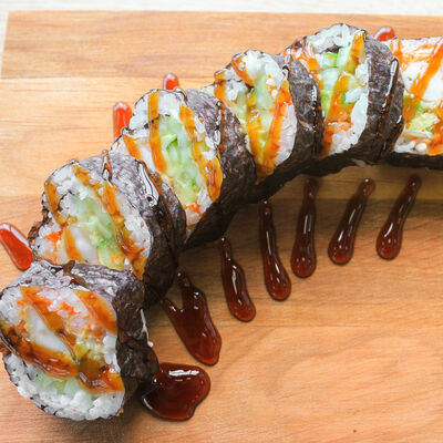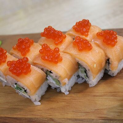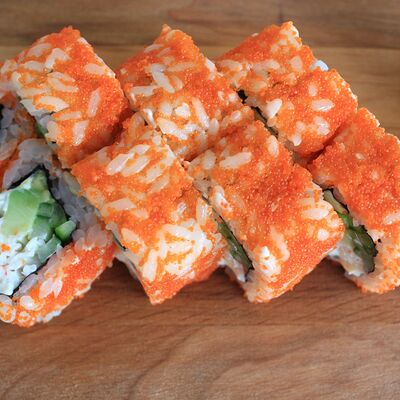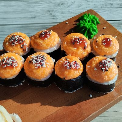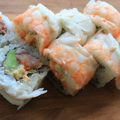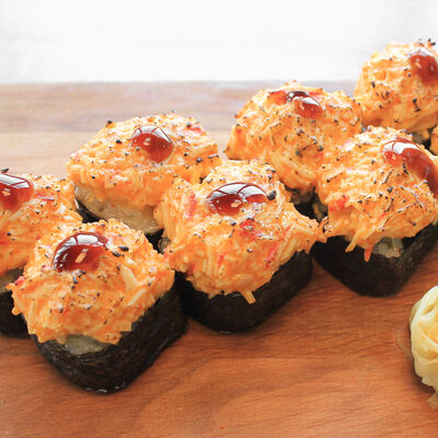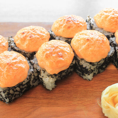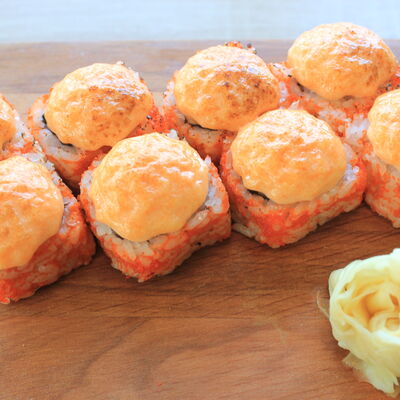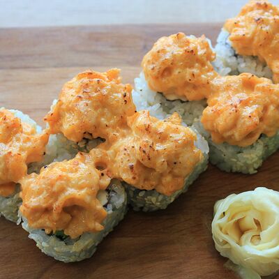 Рис, нори, огурец, авокадо, креветка тигровая, спайси соус, сыр пармезан