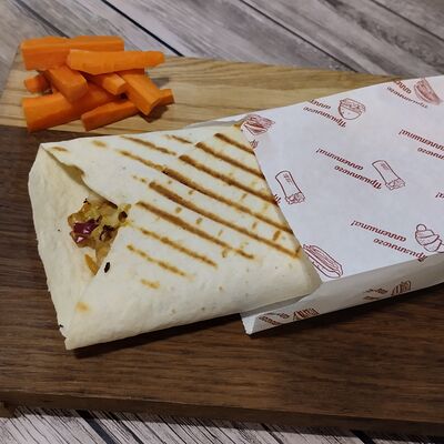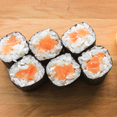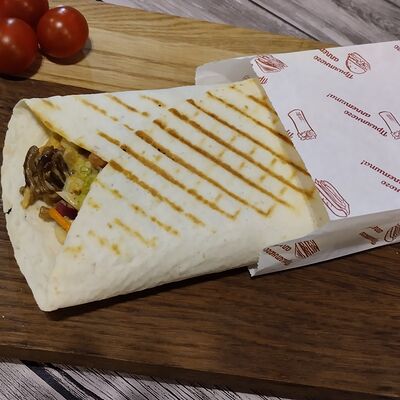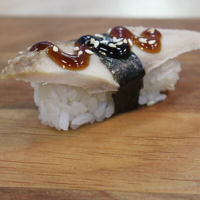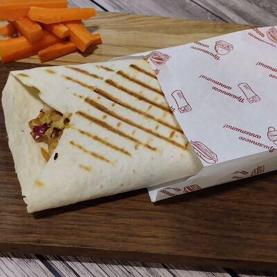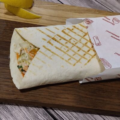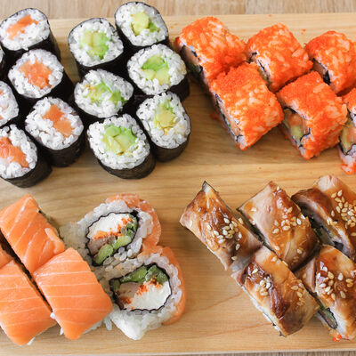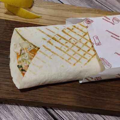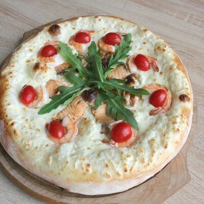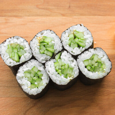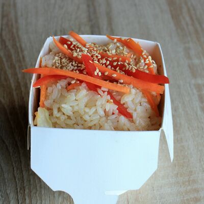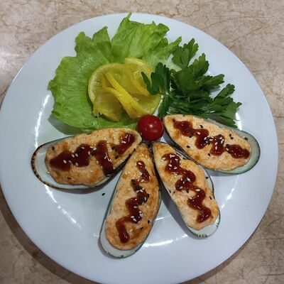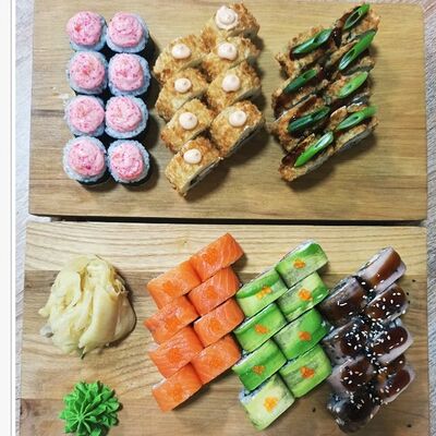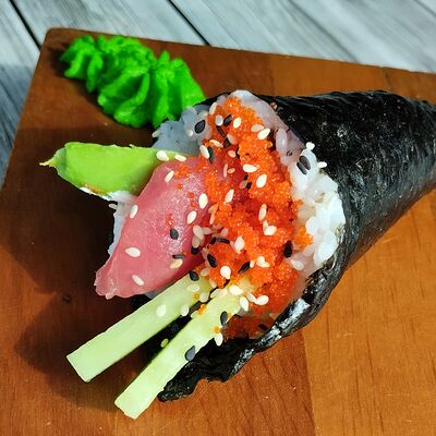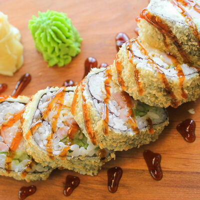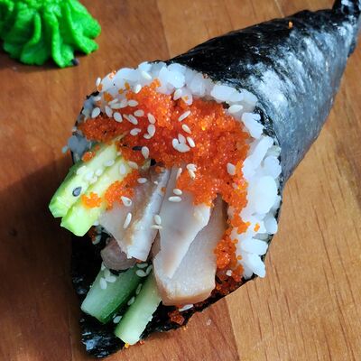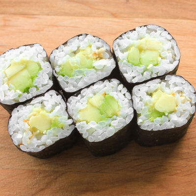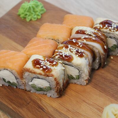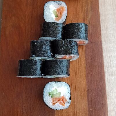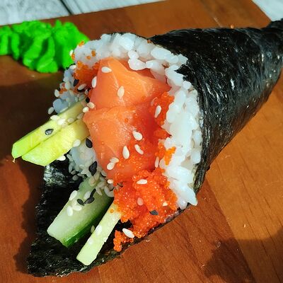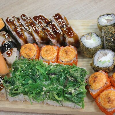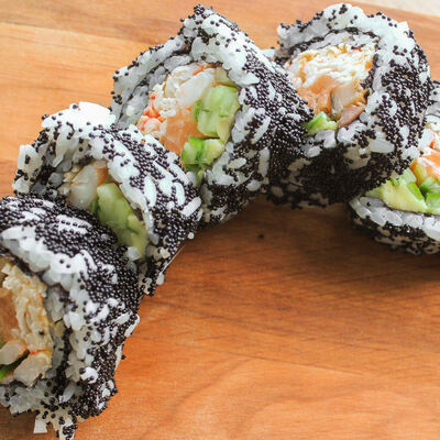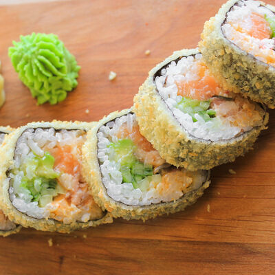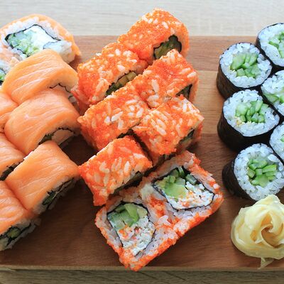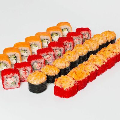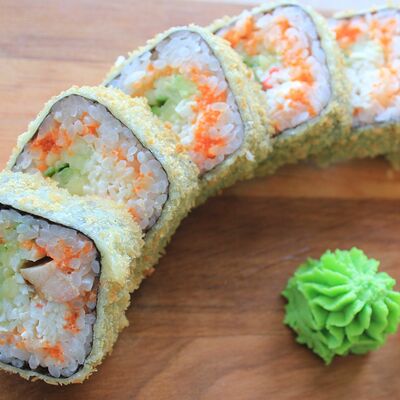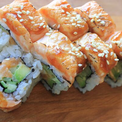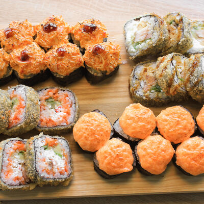 Рис, нори, огурец, авокадо, креветка тигровая, спайси соус, сыр пармезан
