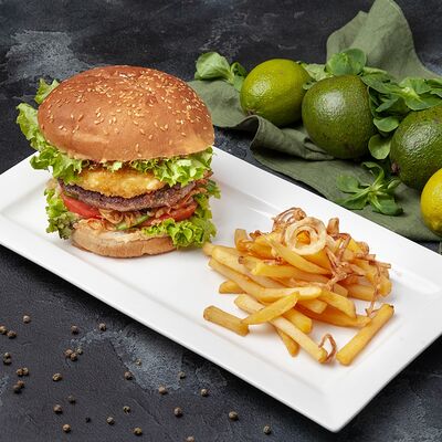Сырный соус, охотничья колбаска, пепперони, салями, бекон, говяжий фарш, маринованные огурцы, размером 32х32