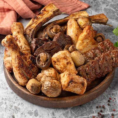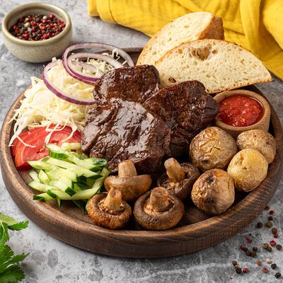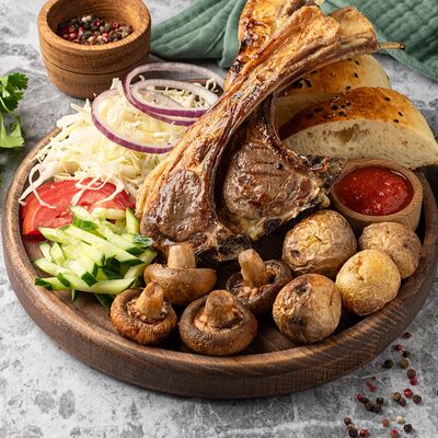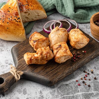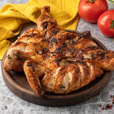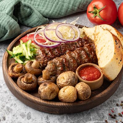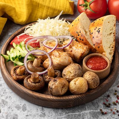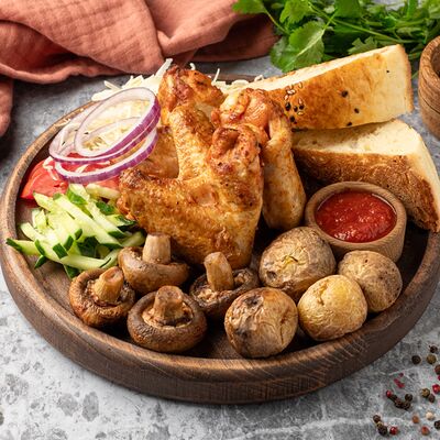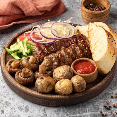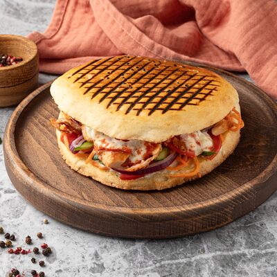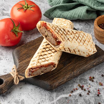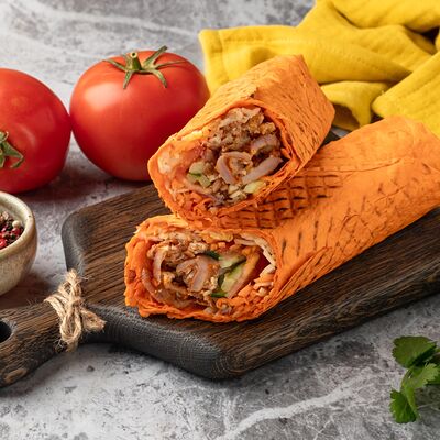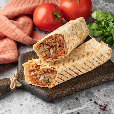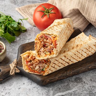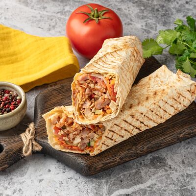 Жареное куриное филе с добавлением фирменных кавказских специй, спелые томаты, свежие огурцы, хрустящий салат, корейская морковь, соус BBQ, фирменный чесночный соус. Все это - в свежеиспеченной лепешке из тандыра