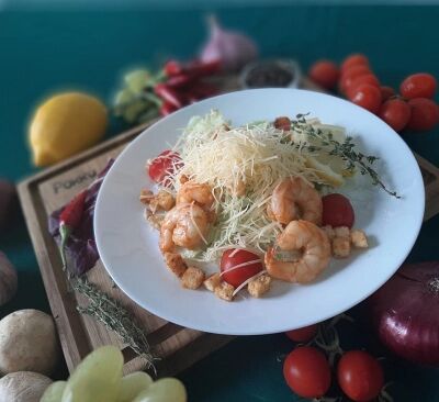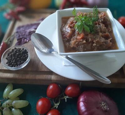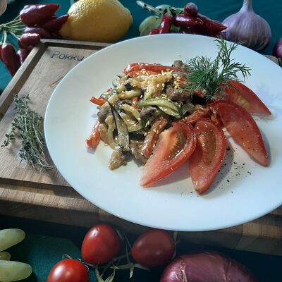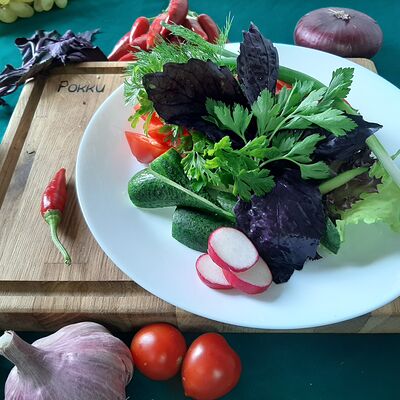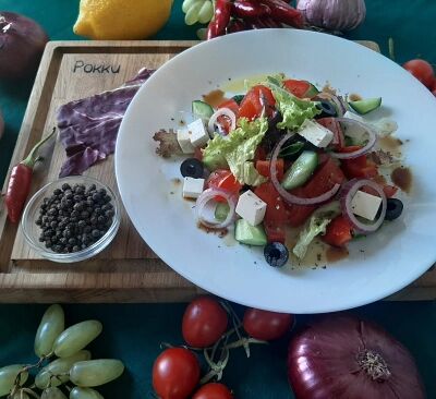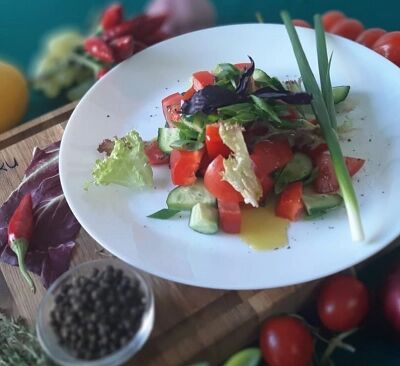 Огурцы, помидоры, перец болгарский, лук, оливковое масло, специи