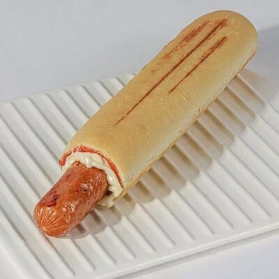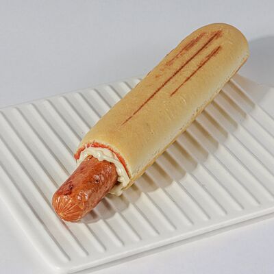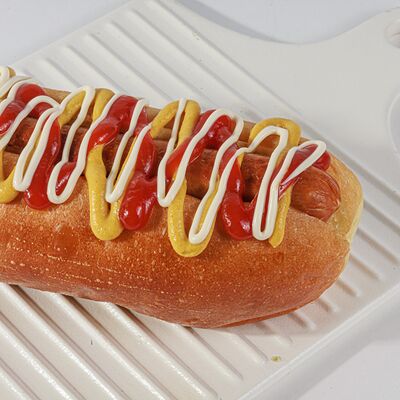 Булочка, куриная сосиска, кетчуп, майонез, горчица