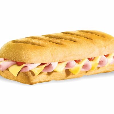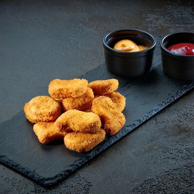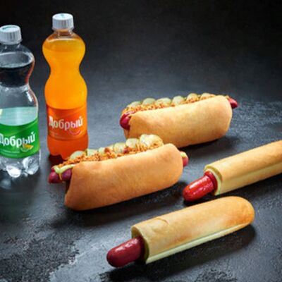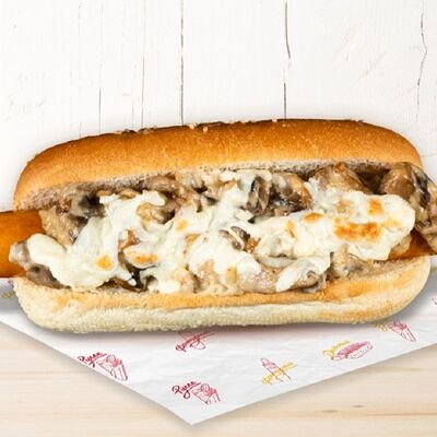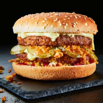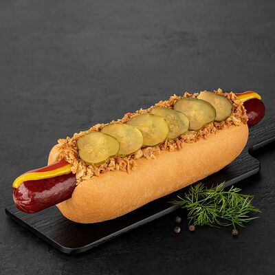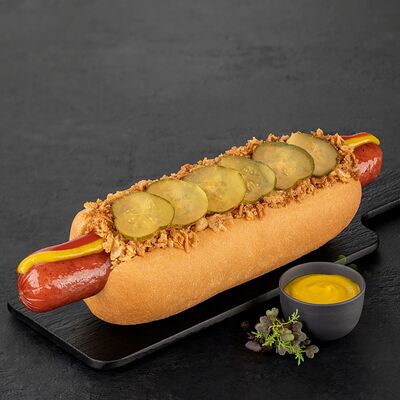 Хрустящая булочка с запеченным филе куриной грудки, маринованными огурцами, жареным луком и горчичным соусом