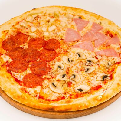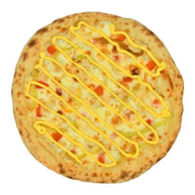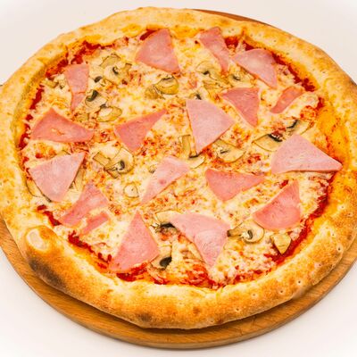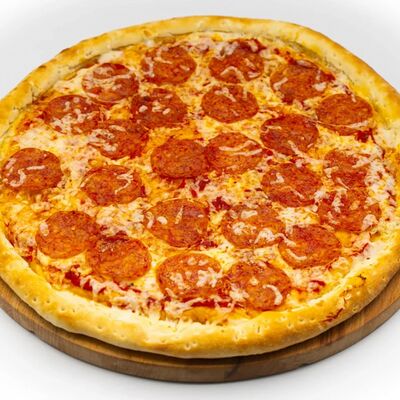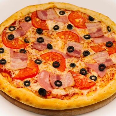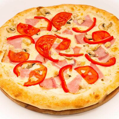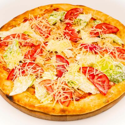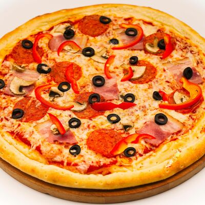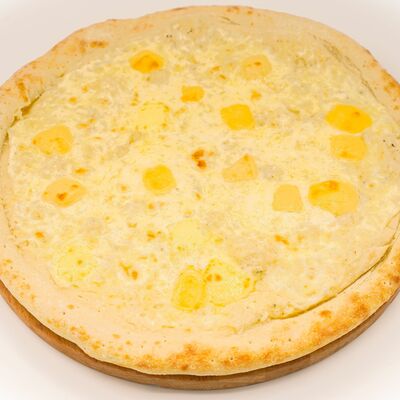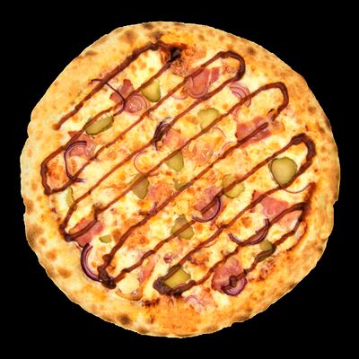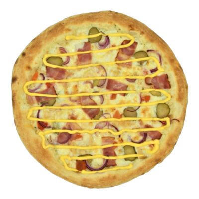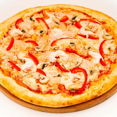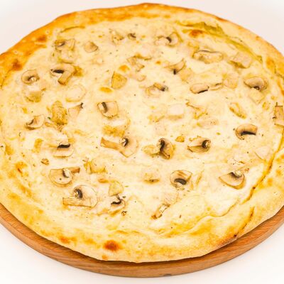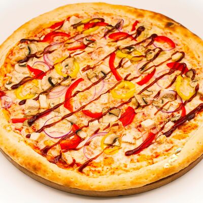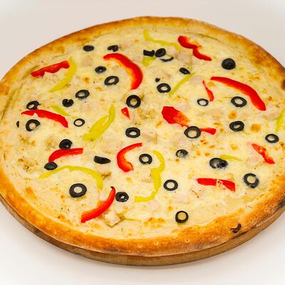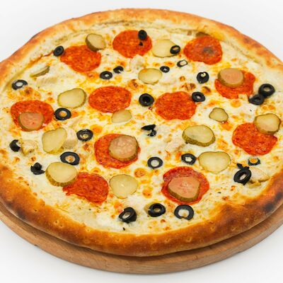 Соус бешамель, тесто для пиццы, нежный сыр моцарелла, нежное куриное филе, оливки, маринованные огурцы, пепперони. Размер на выбор