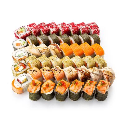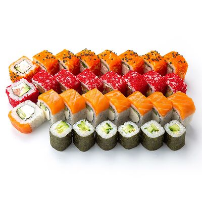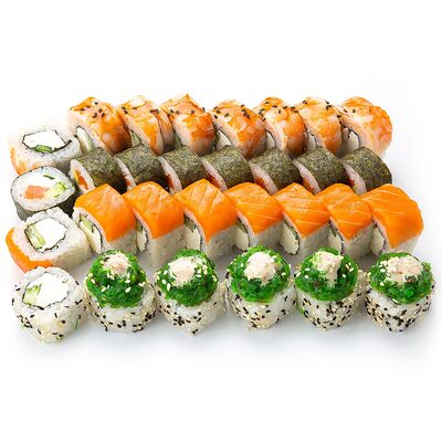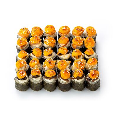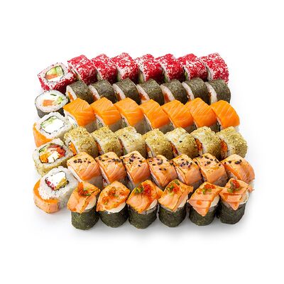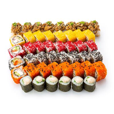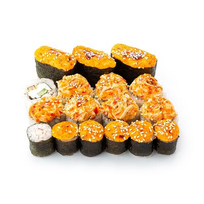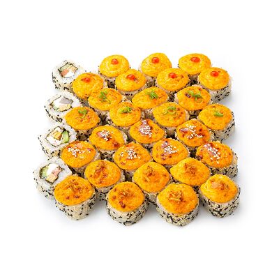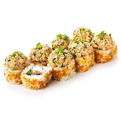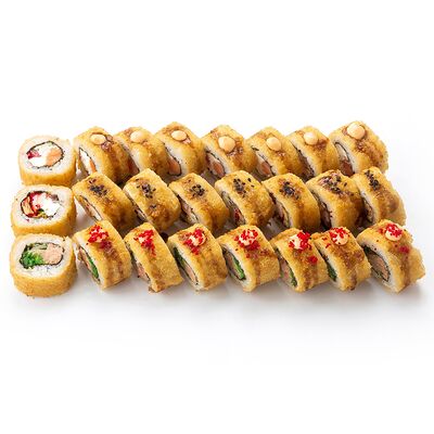 Роллы темпура: с лососем (лосось, рис, нори, панировка), с тунцом (тунец, рис, нори, панировка), с креветкой (креветка, рис, нори, панировка), соевый соус (60 мл)