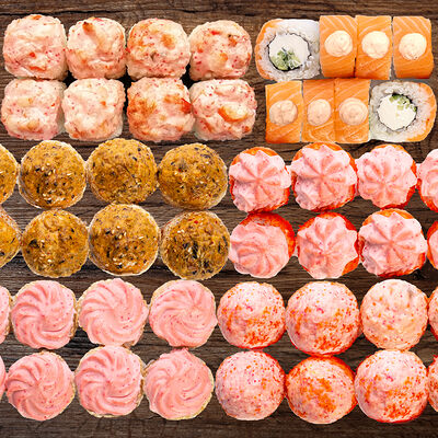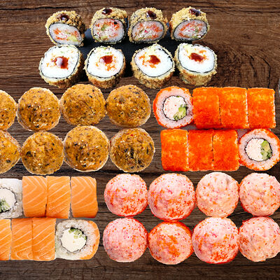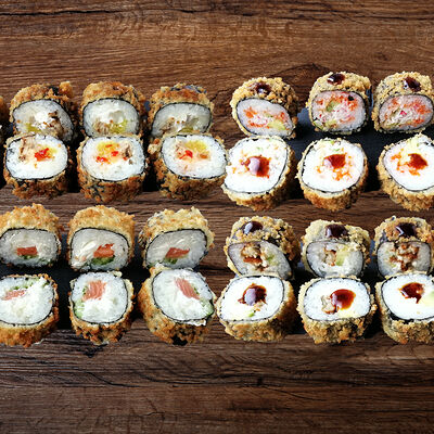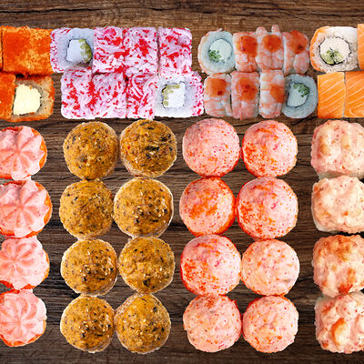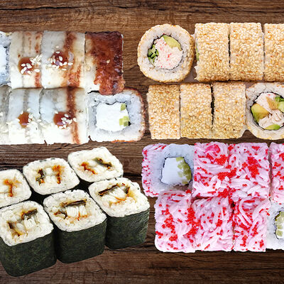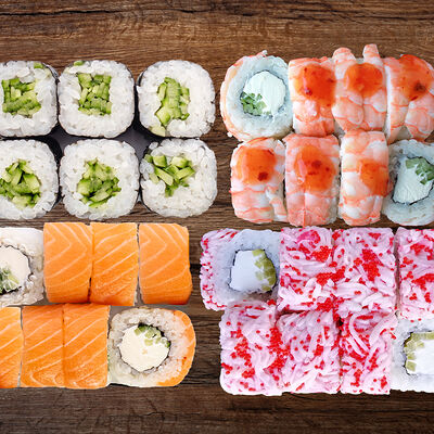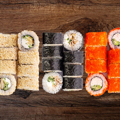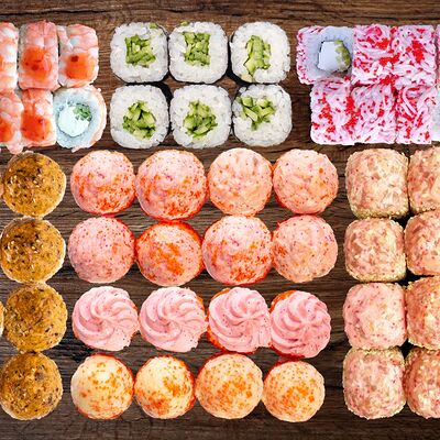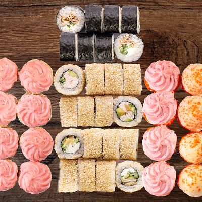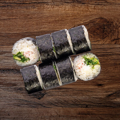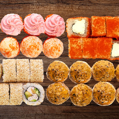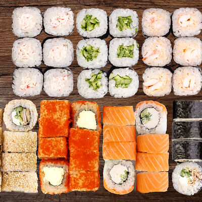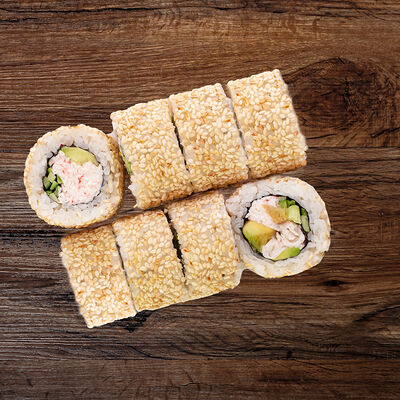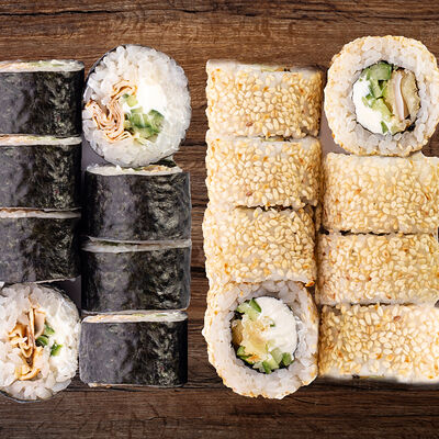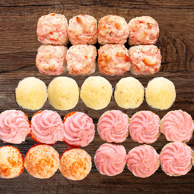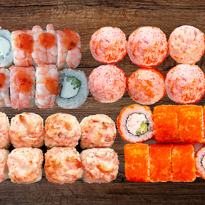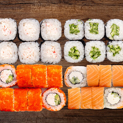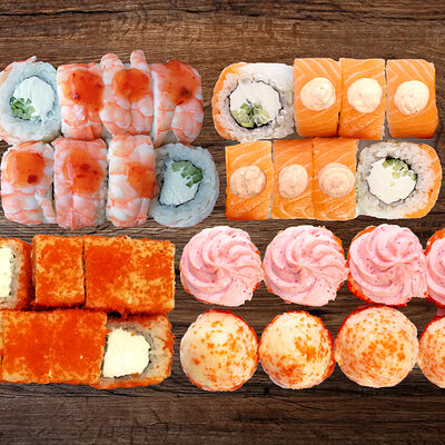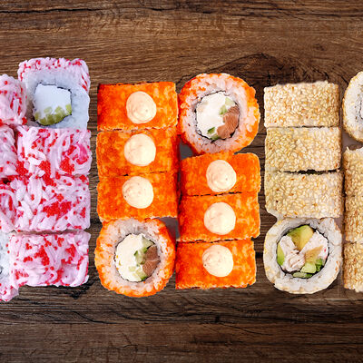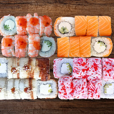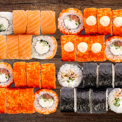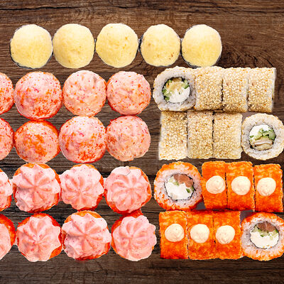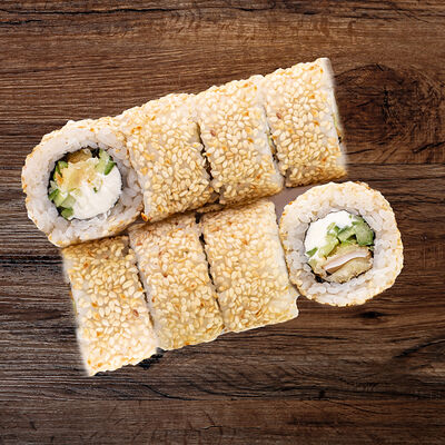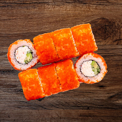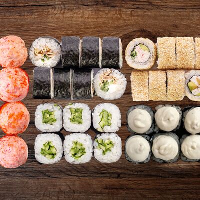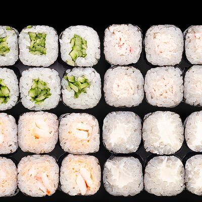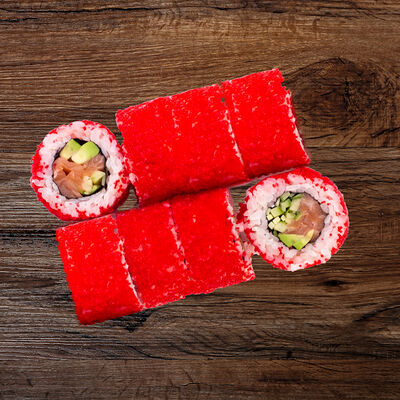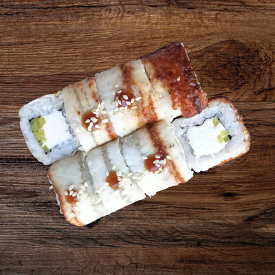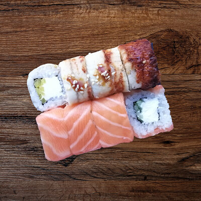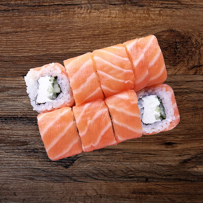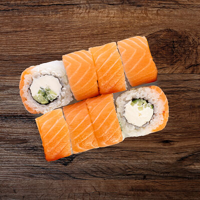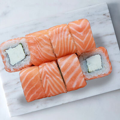 Лосось охлажденный, сыр сливочный, огурец, соевый соус (30 г)